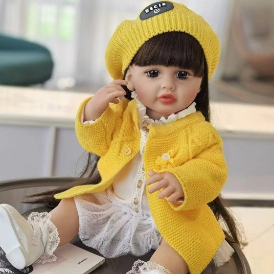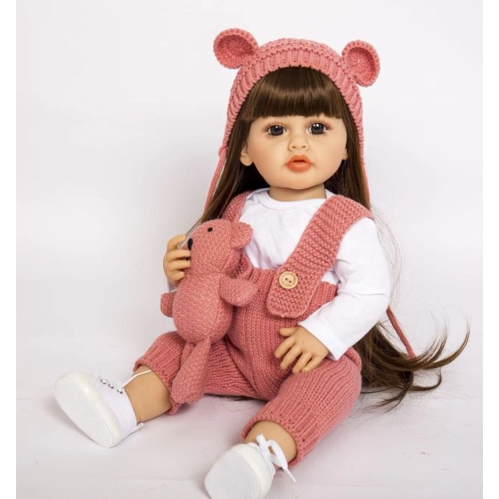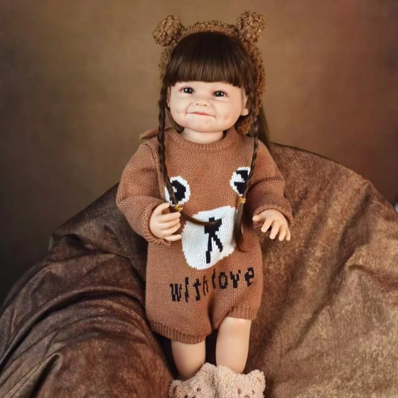 Full rubber lifelike doll, Smile model, brown long hair, black eyes, with brown new-style sweater jumpsuit + brown hairband + brown bear socks (nuomuxiong)