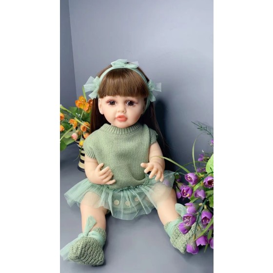 Life-like doll with brown long hair and starry blue eyes, paired with a green sweater set (including a headband and socks), plus 1 bracelet and 2 hair ties (nuomuxiong).