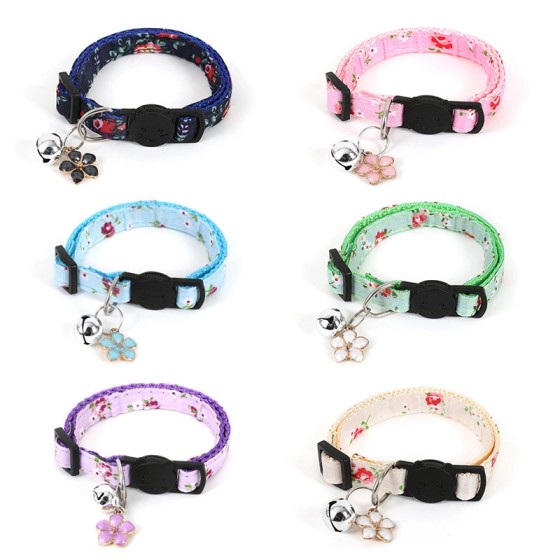 Pet Collar with Safety Buckle & Bell Flower Charm - Adjustable (18-28cm), Soft Nylon, Washable - 6 Colors (Navy, Pink, Light Blue, Green, Purple, Beige) Floral Print Design, Adorable Decoration for Dogs Cats, 1.0*30cm, Single Piece
