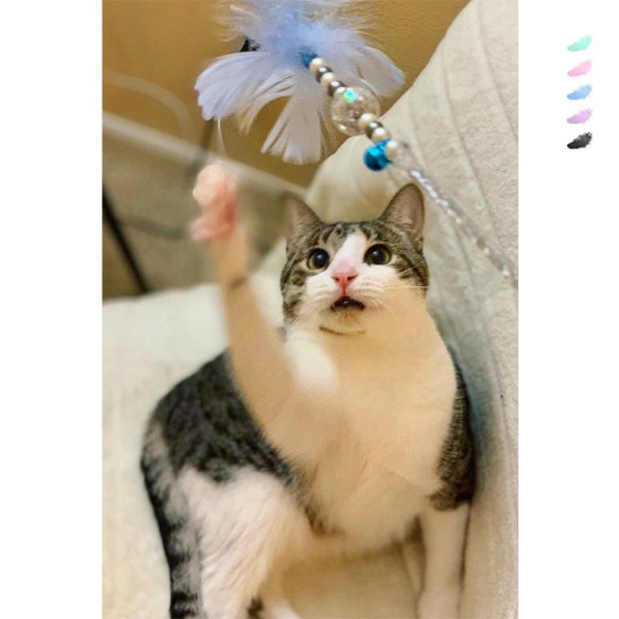Cat Teaser Wand Single Stick: 40cm Sparkling Pole + 14cm Colorful Feathers with Bell & Beads - 3 Color Options (Pink/Mint Green/Blue) - Interactive Cat Toy for Hunting Instinct - Indoor Exercise Feather Stick for Cats
