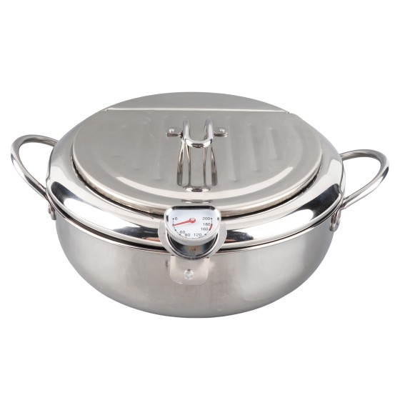 H日式可控温天妇罗炸锅 带温度计 不锈钢迷你快炸锅 电磁炉燃气灶通用 含滤网防烫手柄 24cm大号【3.2L】
