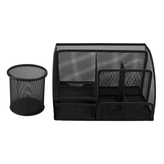 Metallischer Schreibtisch-Organizer mit Schublade - 7-Fach Mesh Stiftehalter Set + runder Penholder - Netzschale für Büro, Homeoffice, Schule - Stiftebox schwarz (Kratzfester Design)