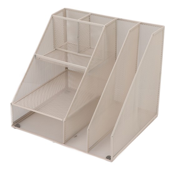 Weißer Metallischer Schreibtisch-Organizer, 3 Ebenen & 2 Fächer, Stabiles Stahlrohr-Gitter Design für A4 Akten, Bürobedarf als Ablagefach & Stiftehalter, Höhenverstellbar