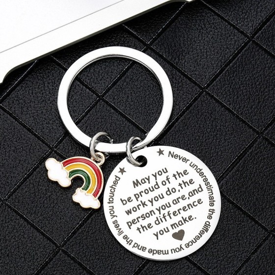 Einzelner Kollegen-Schlüsselanhänger mit Gravur "Großartige Kollegen sind schwer zu finden..." & Regenbogen-Emaille - Ø30mm Anhänger + Herz-Ausschnitt - Abschiedsgeschenk für Bürofreunde oder zur Berufsverabschiedung