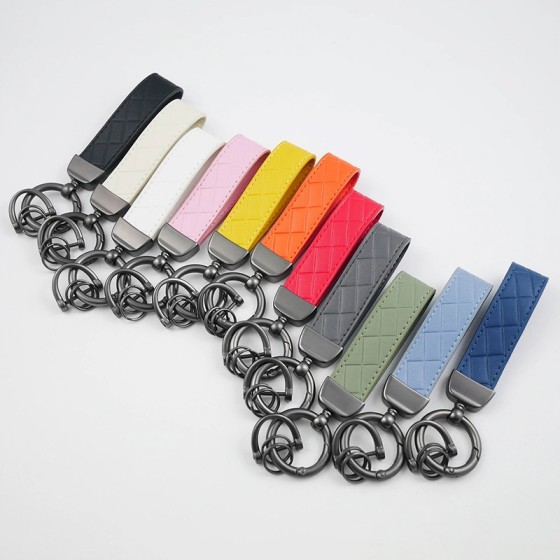 Einzelner Hochwertiger Leder-Schlüsselanhänger mit Diamant-Prägung & Schiebeverschluss (11 Farben: Tiefblau, Hellblau, Grün, Beige etc.) - 80mm Nappalederband + Schwarz beschichteter Metallring Ø35mm - Für Autoschlüssel & Reisetasche