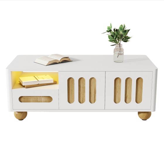 Modern Coffee Table with LED Lights [16 Colors], 4 Doors & 2 Drawers - White Wood Finish TV Console with Rounded Corners, for Living Room, 105x50x40cm