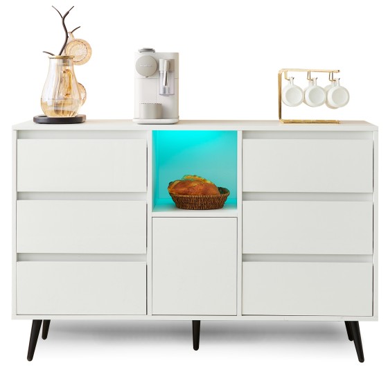 Modern Sideboard with RGB LED Lights & Remote Control, 6 Soft-Close Drawers, Push-to-Open Doors, High Gloss Buffet Cabinet with Metal Legs for Dining Room, Living Room, 47.2''L