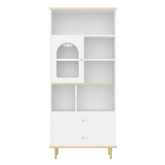 Modern Tall Cabinet with Glass Doors & 3 Drawers, Wood Look (Not Solid Wood) Storage Cupboard for Living Room, Office | 80x34x171 cm Freestanding Shelf with Copper Handles & Display Case
