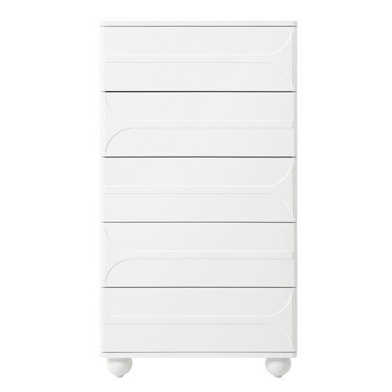 5-Drawer Dresser with Elegant Embossed Design, White Chest of Drawers with Metal Legs, Wide Storage Cabinet with Soft-Close Drawers & Rounded Corners for Bedroom, Living Room