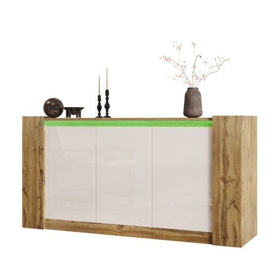 Modern Sideboard with LED Lights, 150cm Buffet Cabinet, High Gloss White & Wood Grain, Soft-Close Hinges, Beveled Handle-less Doors, Adjustable Shelves, for Dining & Living Room