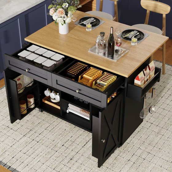 360° Rotating Kitchen Island with Extendable Tabletop (203cm!), Breakfast Bar, Sideboard with Fold-Down Door & Side Shelf, Swivel Cabinet for Living Room, Kitchen, Black