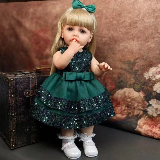 Lebensechte Puppe mit langen goldenen Haaren und strahlend blauen Augen, bekleidet mit einem smaragdgrünen OM-Rock mit weißem Besatz (einschließlich Stirnband), weißen Spitzenstrümpfen und weißen Lederschuhen.