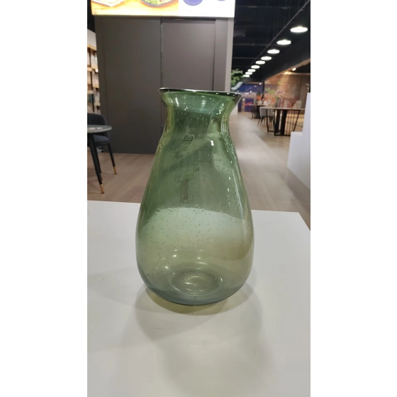 Glasgrüne Tropfenvase mit Naturbläschen Ø12,0cm/9,0cm H36cm - Handgeblasene Wanddekoration für Erkerfenster | Atmosphärisches Lichtspiel im Bauhaus-Loft | Einzelvase mit 1,5cm Wandstärke für natürliche Raumgestaltung