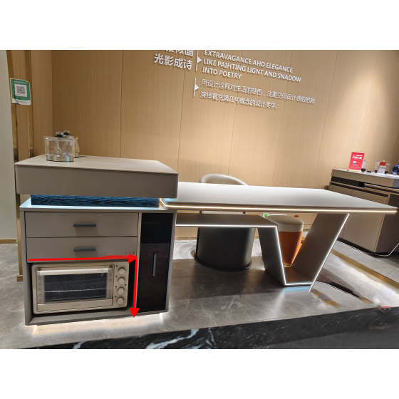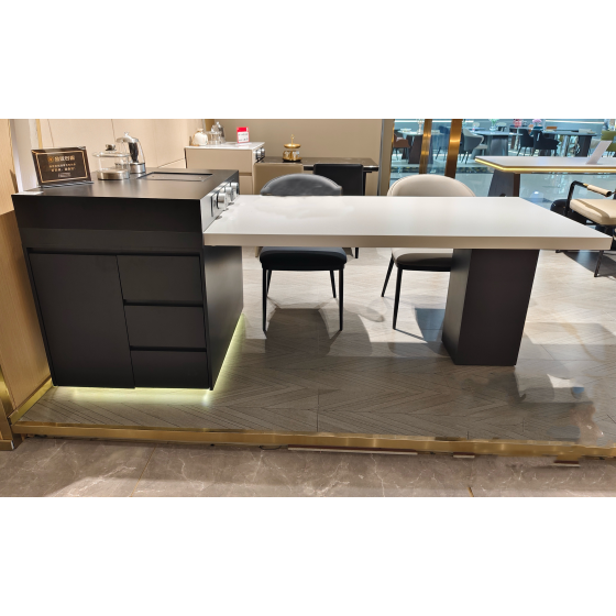 CT-201/202 Kücheninsel mit Einbaunische & LED-Beleuchtung|CT-201: Hellbraune Steinplatte + Weißer Tisch (250×80cm fest)|CT-202: Graue Steinplatte (225-250cm verstellbar)|Für 55cm Backöfen/50cm Kühlschränke|Melaminbeschichtet Schubladen + Touch-Schalter