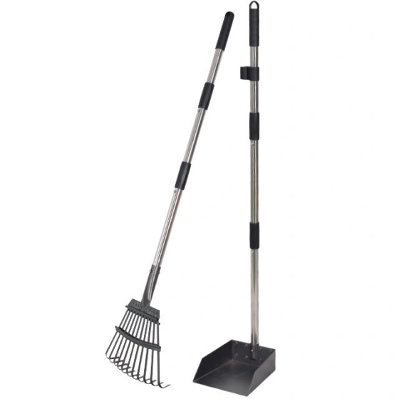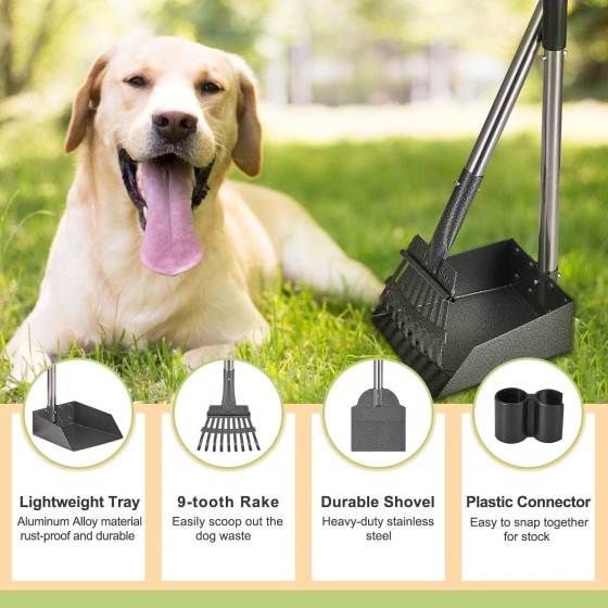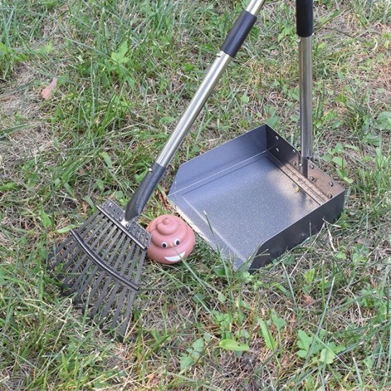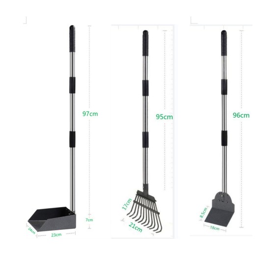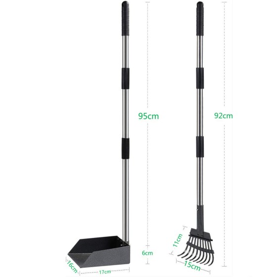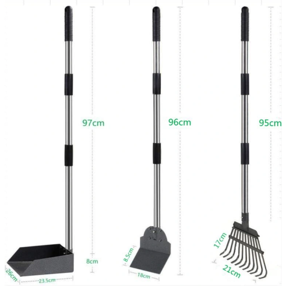 Hygienisches Haustierkot-Dreier-Set - 95cm Kehrschaufel + 92cm 9-Zinken-Rechen + Handbesen | Stehend reinigen für Rasen & Terrasse