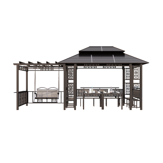 Gartenpavillon Komplettset 4x3m|Alu-Stahl Rahmen + Möbel|Wahl-Dach: 0,4mm Stahlblech/0,6mm Polycarbonat|Doppeldach Design mit 30x30mm Sitzprofil - Schwarzes Metall