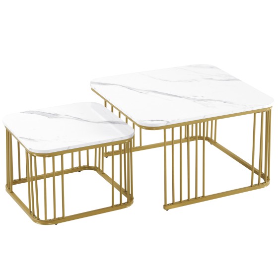 2er Set Quadratische Couchtische ineinander schiebbar, Hochglanz Marmoroptik (Nicht Marmor) Couchtisch Set mit Goldenen Beinen & höhenverstellbaren Füßen, Platzsparend für Wohnzimmer und kleinen Raum, (70x70x45 & 50x50x36,5 cm)