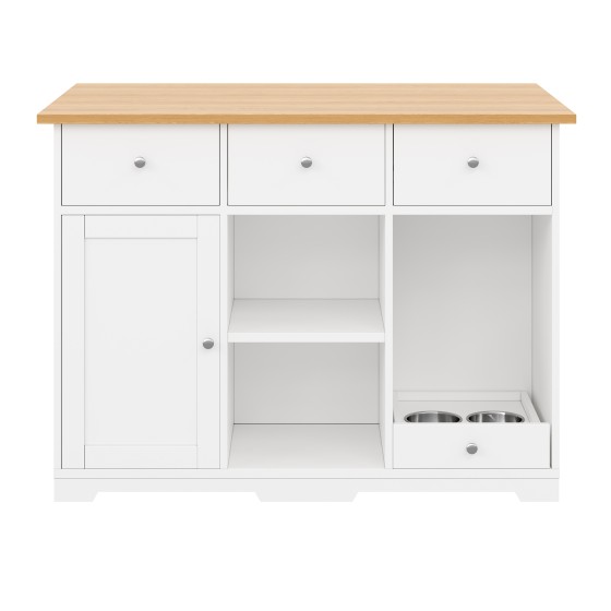Küchenwagen mit Haustierfressnapf, Mobiler Servierwagen mit Schublade & Regal, Rollbarer Kücheninselwagen 120x70x90cm, Weiß – Für Küche, Wohnzimmer, Essbereich, Haustierfreundlich mit Edelstahlnapf & verstellbarem Boden