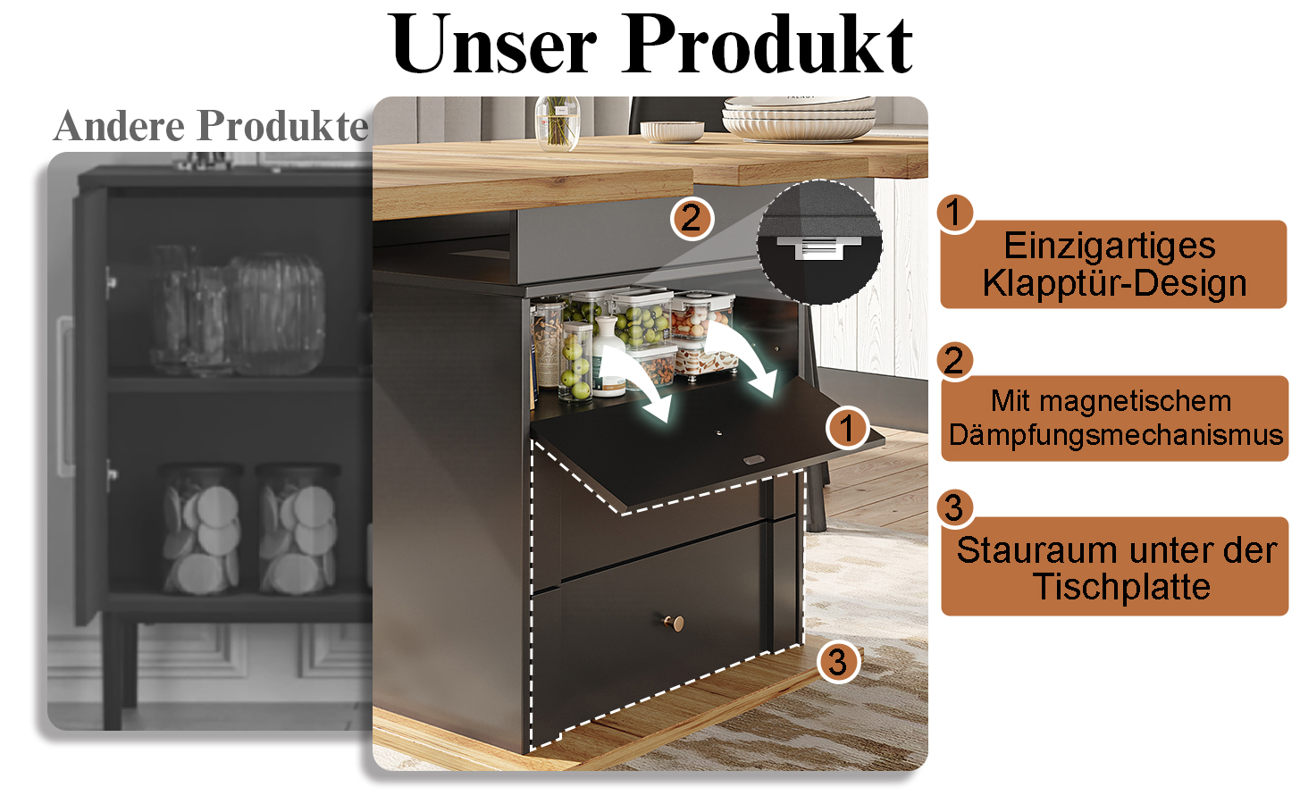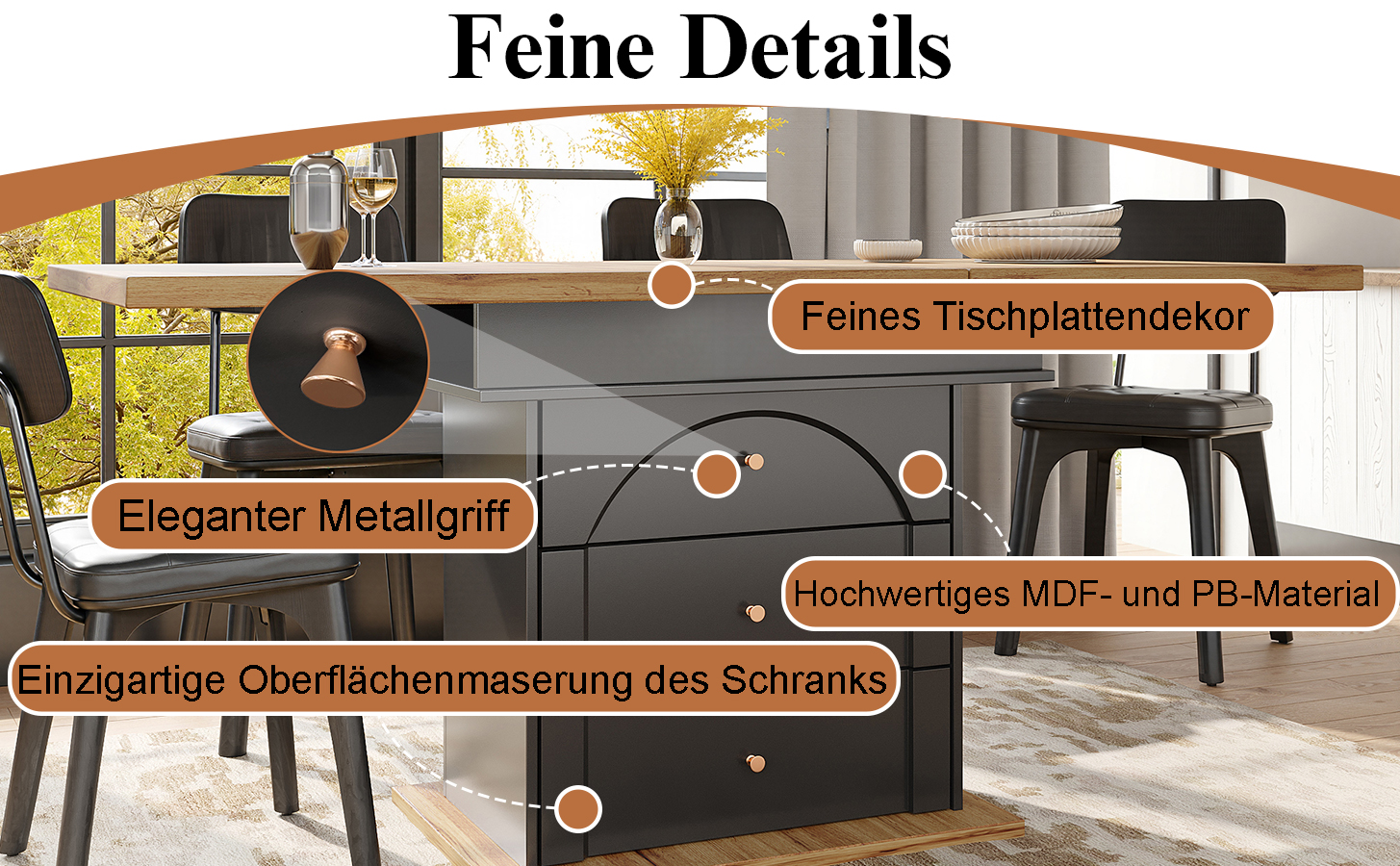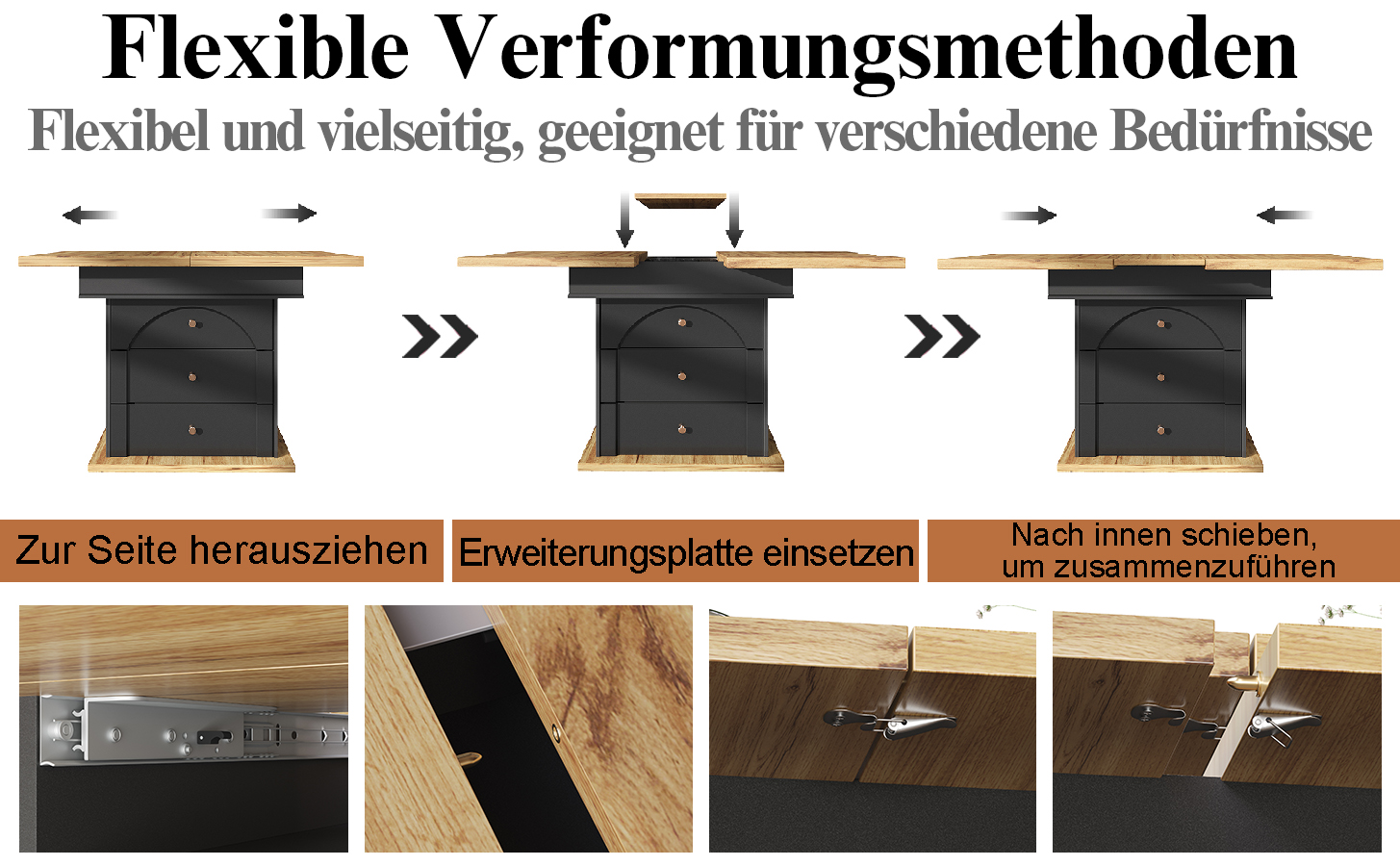 Ausziehbarer Esstisch 110-140cm mit Klapptüren & Stauraum, platzsparender Küchentisch für 4-6 Personen, klappbarer Tisch mit Schublade, wohnzimmertauglich, schwarz