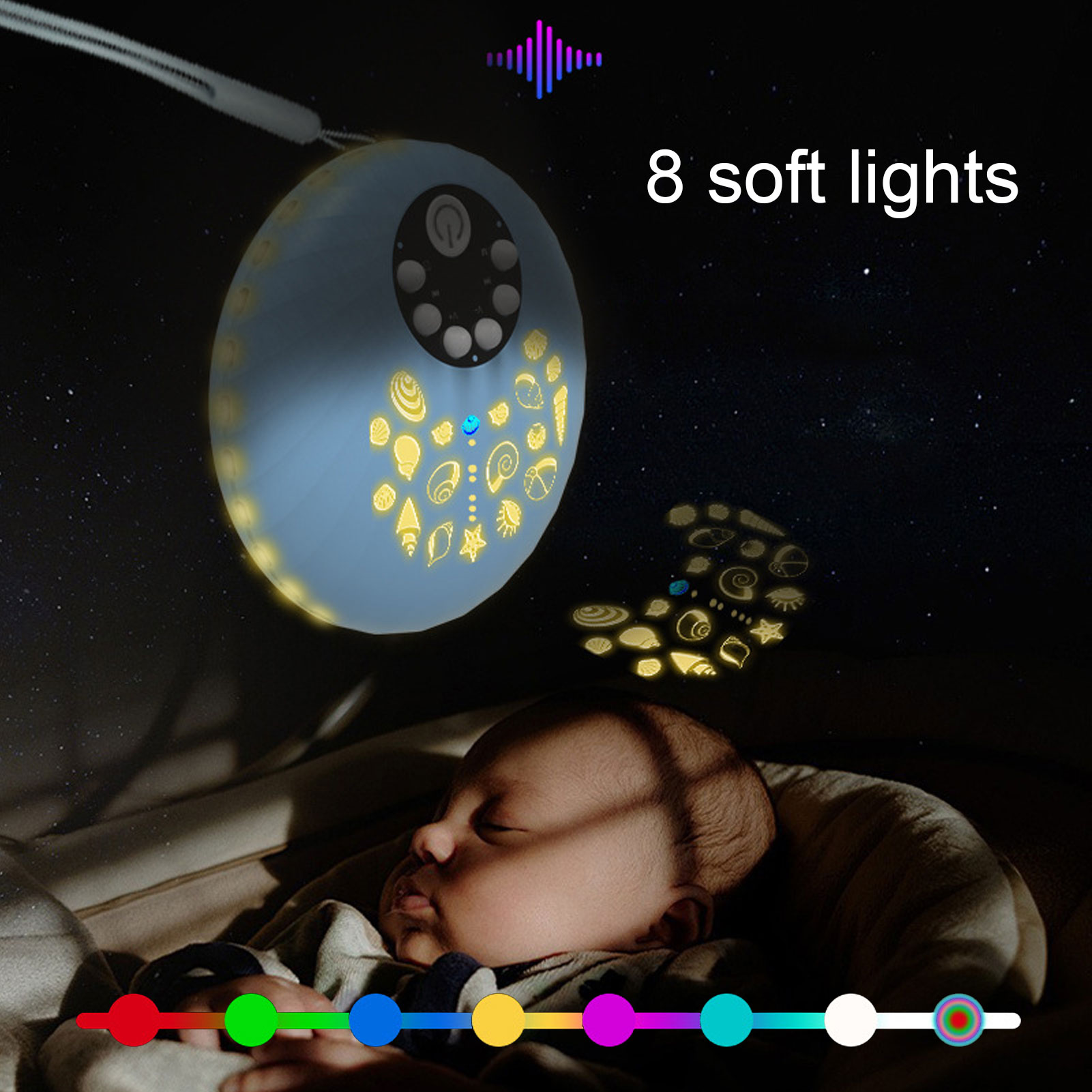8种灯光颜色:红、绿、蓝、黄、紫、青、白、变色