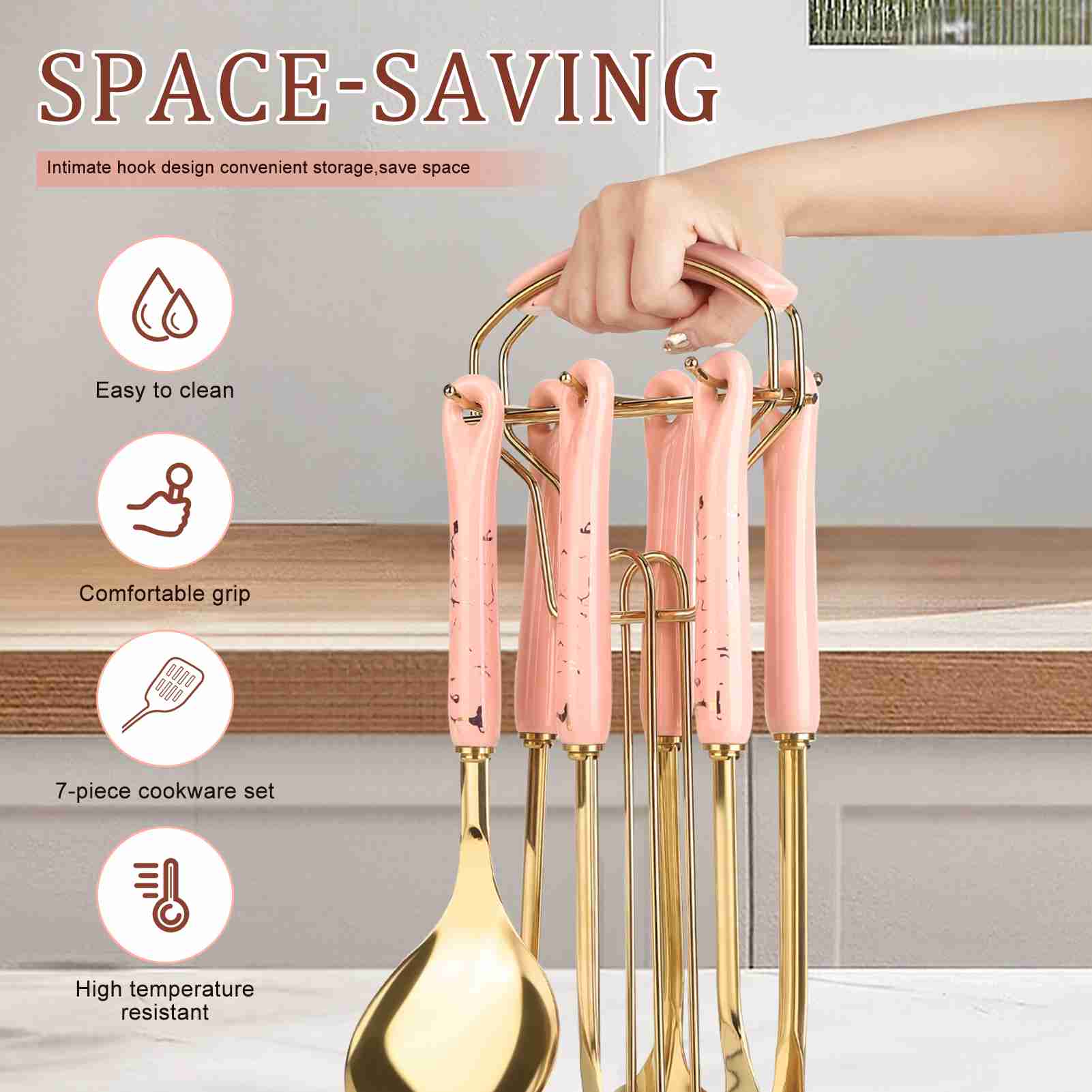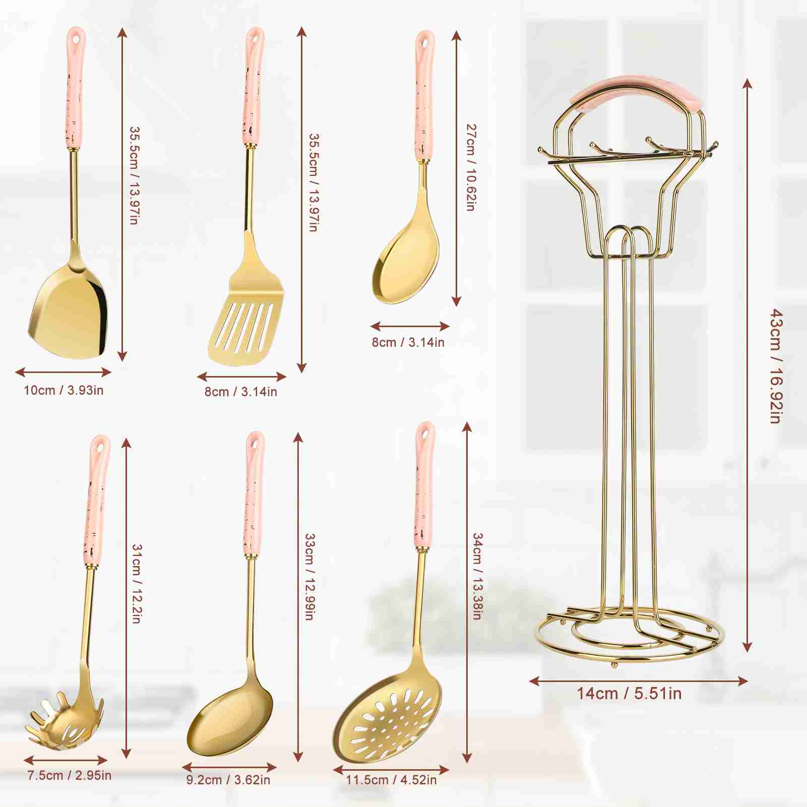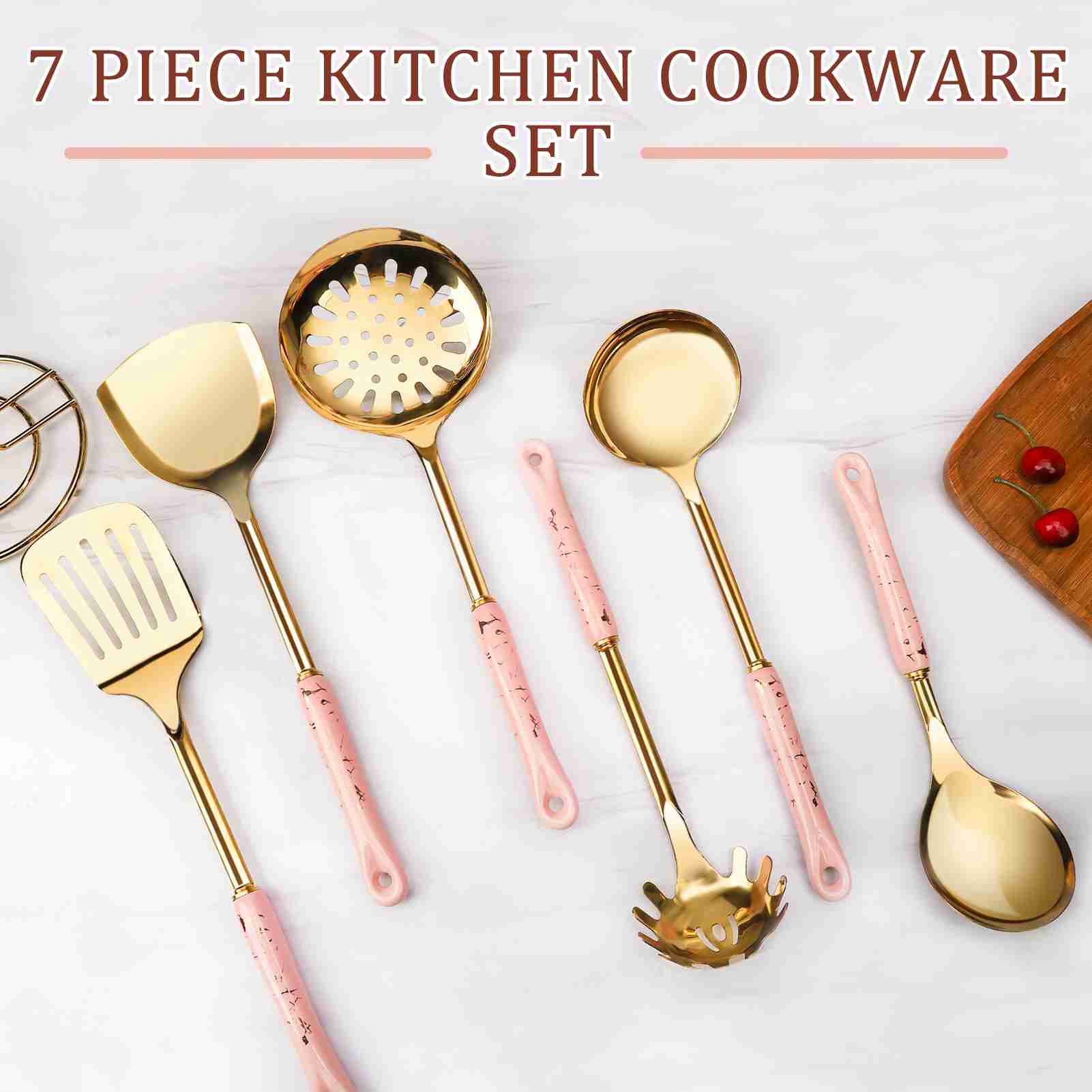 7-Piece Luxury Kitchen Utensil Set, Non-Stick & Heat Resistant, Pink Gold Ceramic Handle with Stainless Steel, Includes Holder - Elegant Cooking Gift for Wedding, Housewarming