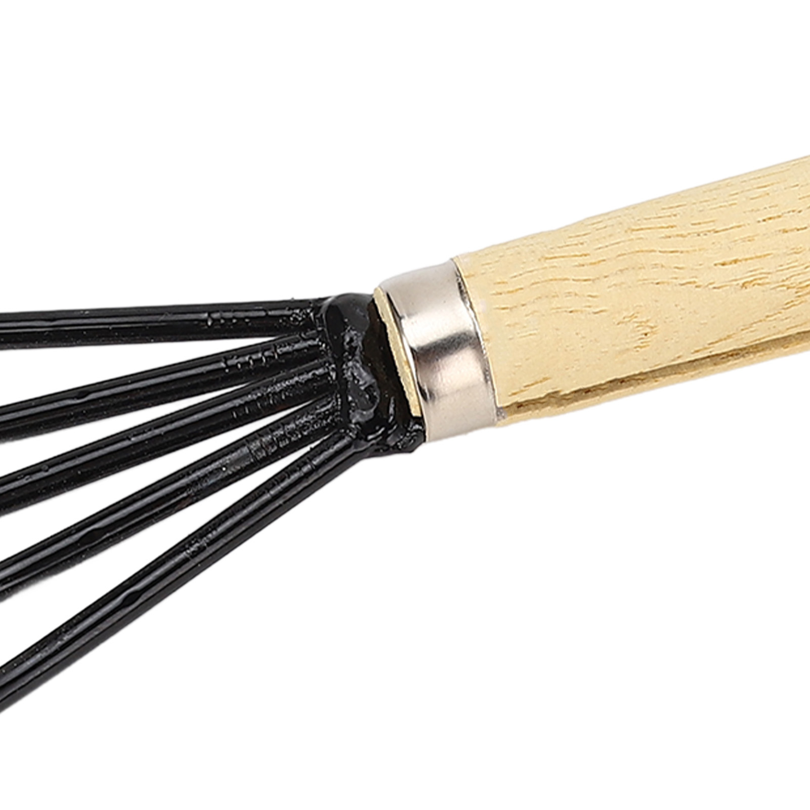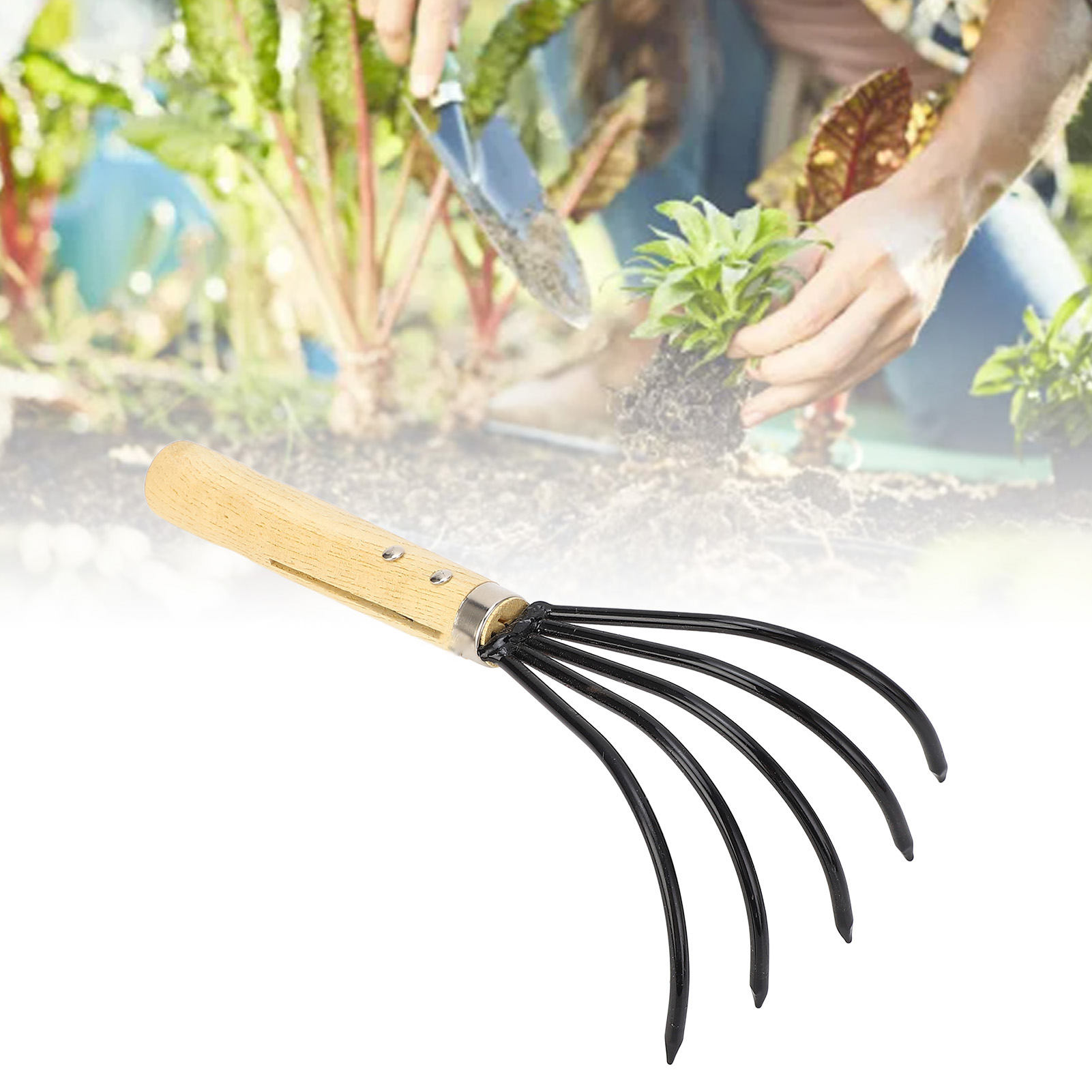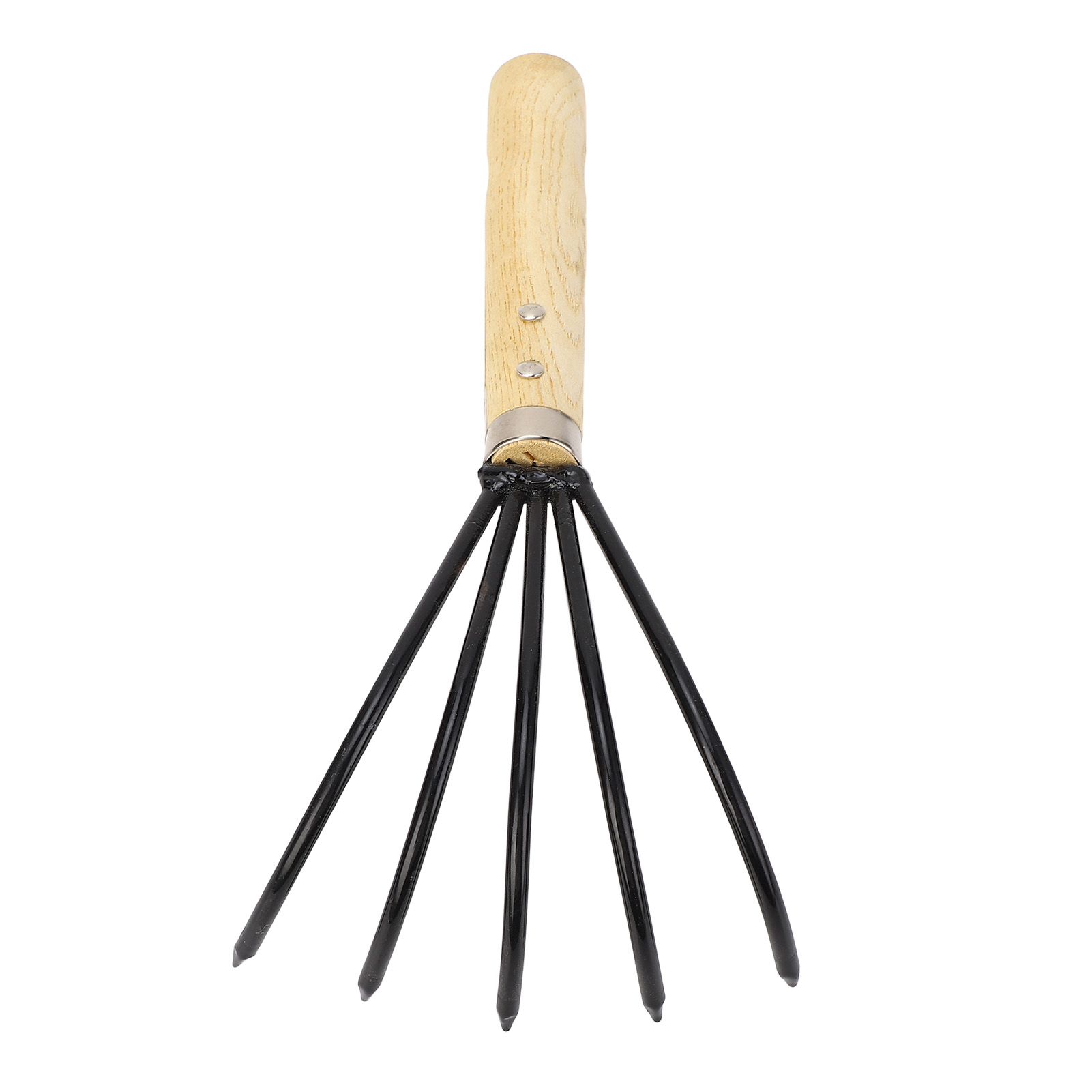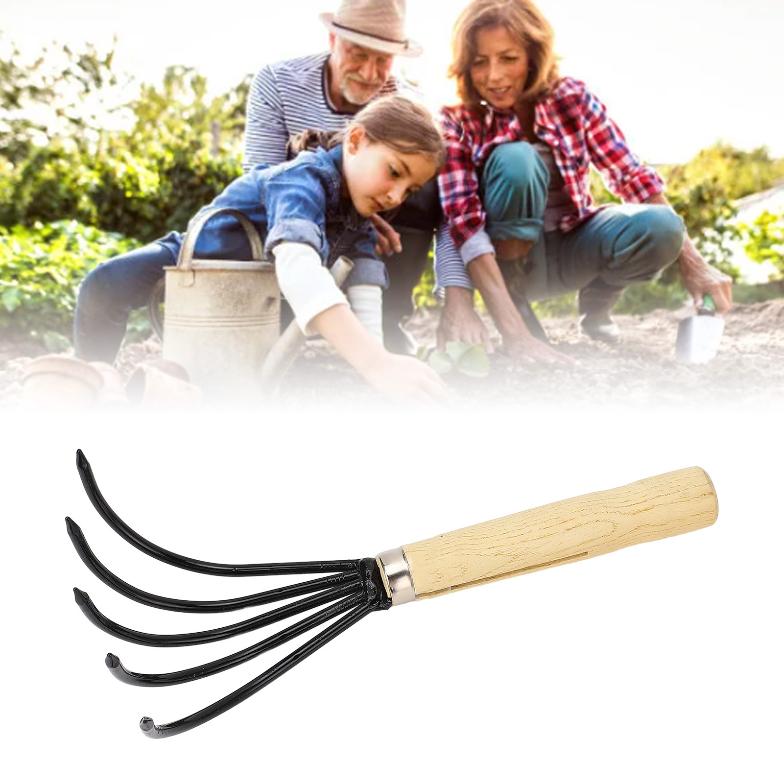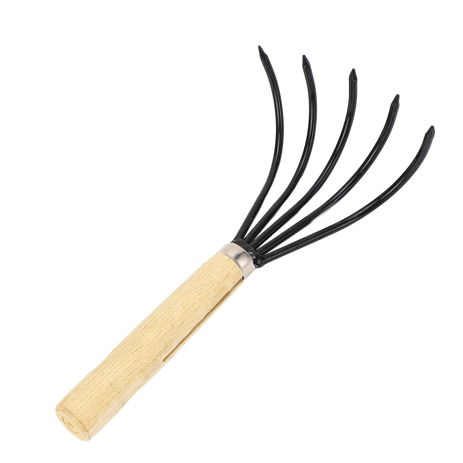 标题: 5-Tine Hand Rake, Short Handle Claw Cultivator with Wood Handle - Carbon Steel Garden Hand Tool for Weeding, Soil Aeration & Tilling in Flower Beds