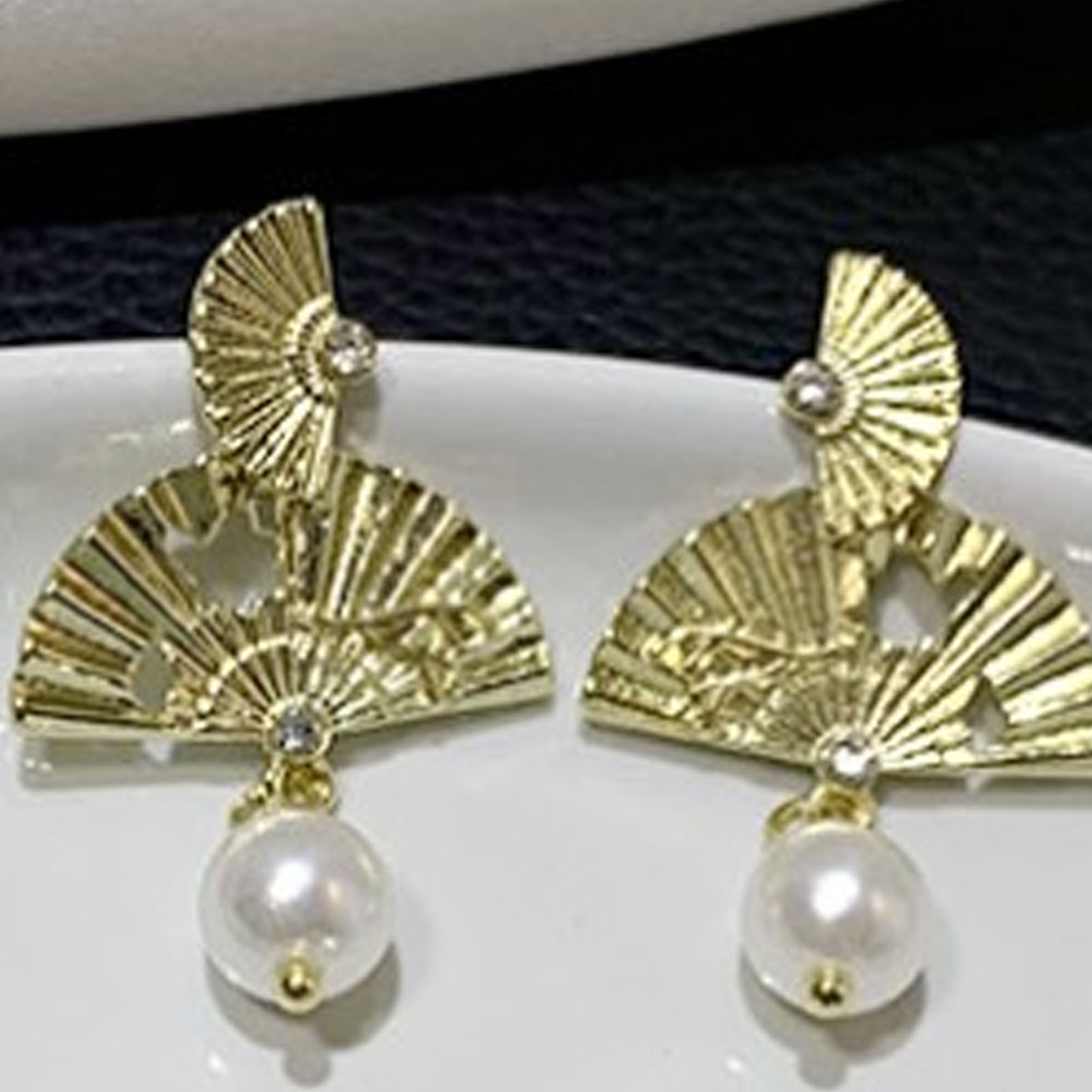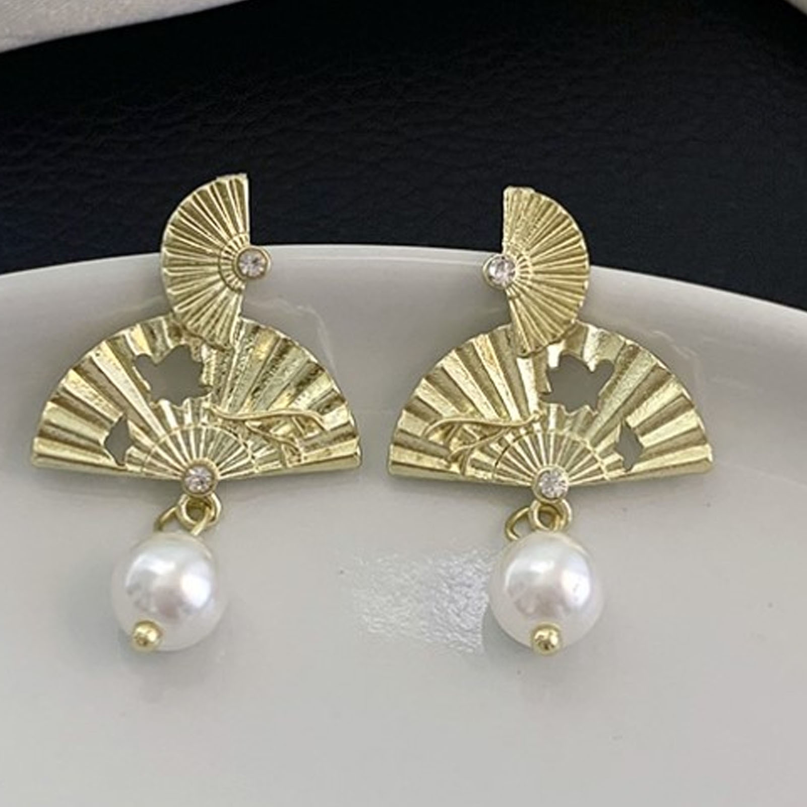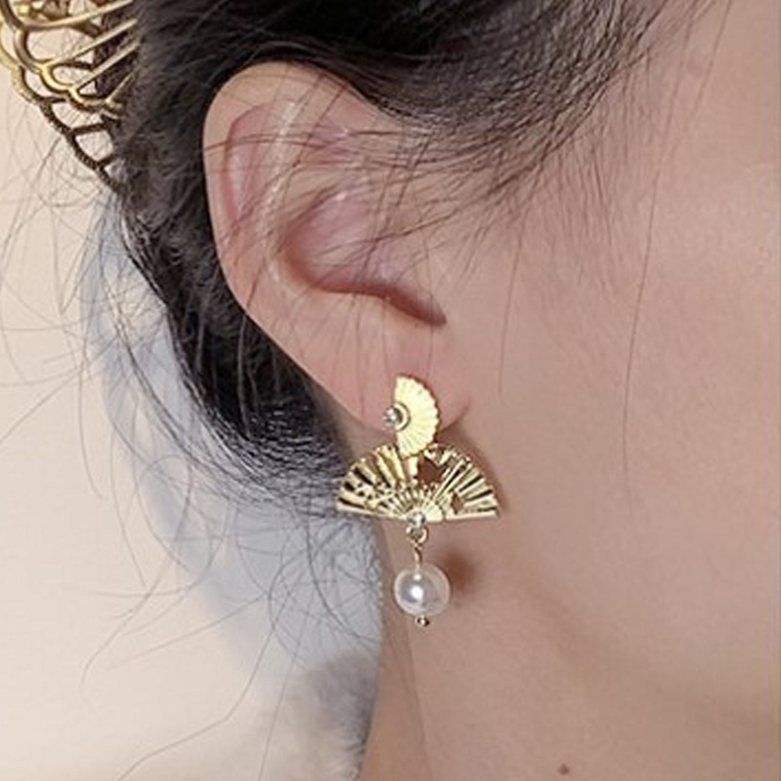 新中式耳环925银针高级感复古中国风耳钉国潮轻奢耳坠古风耳饰女(银针-扇面 珍珠)YM 1511230067311 K