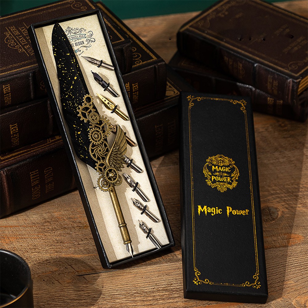 欧式复古机械羽毛笔蘸水笔套装 8个替换笔芯 SP380-02齿轮洒金尖头黑色 YMOS9404B G