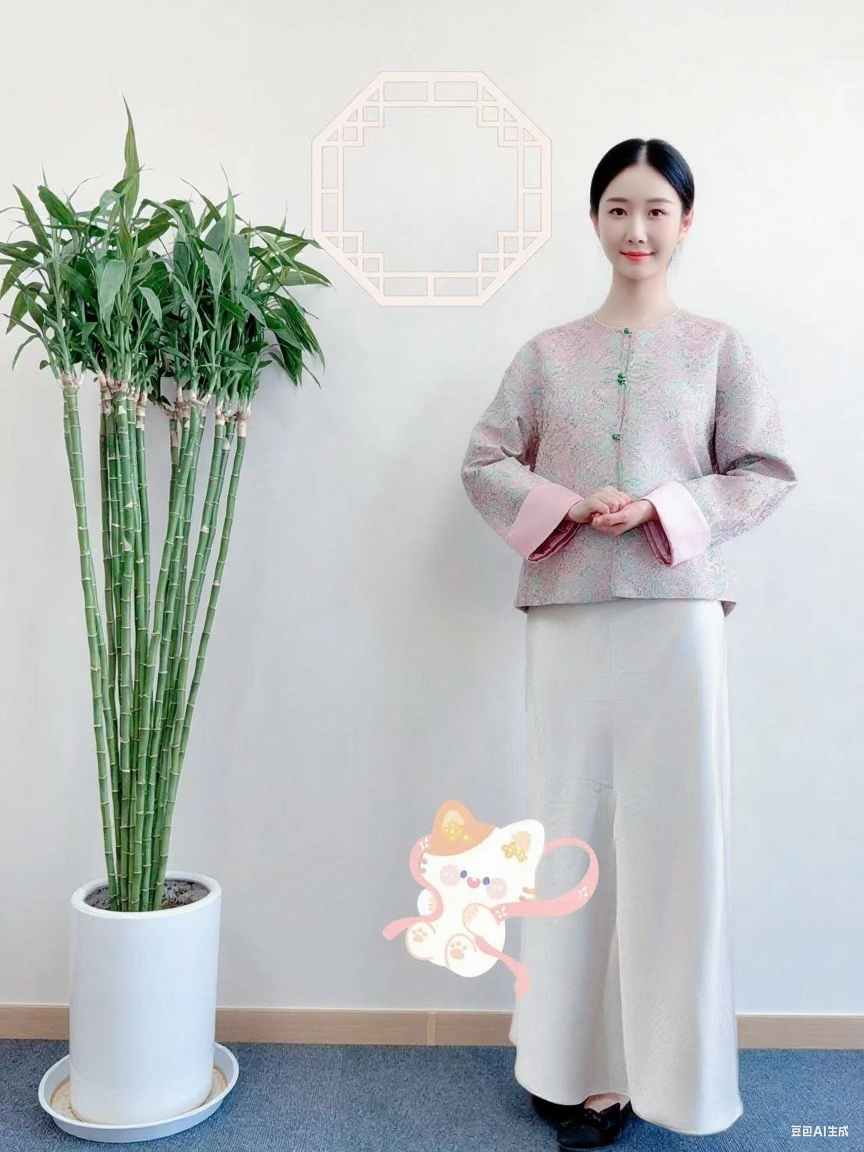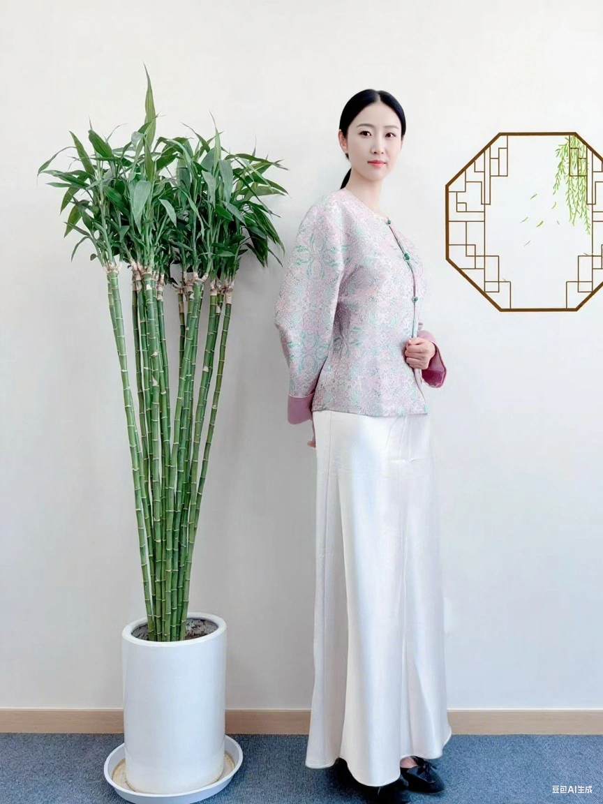 ➤ 圆领+绿玉盘扣:修饰脖颈线条,一抹翠色点亮古典韵味