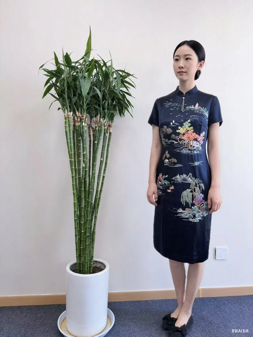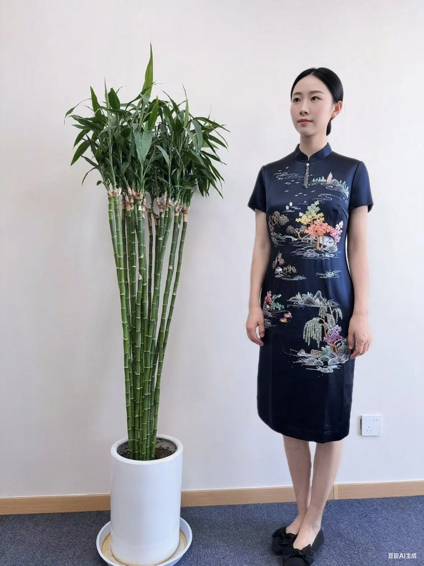 ✅ 深蓝真丝底料 + 手工苏绣山水(山峦/垂柳/河流)