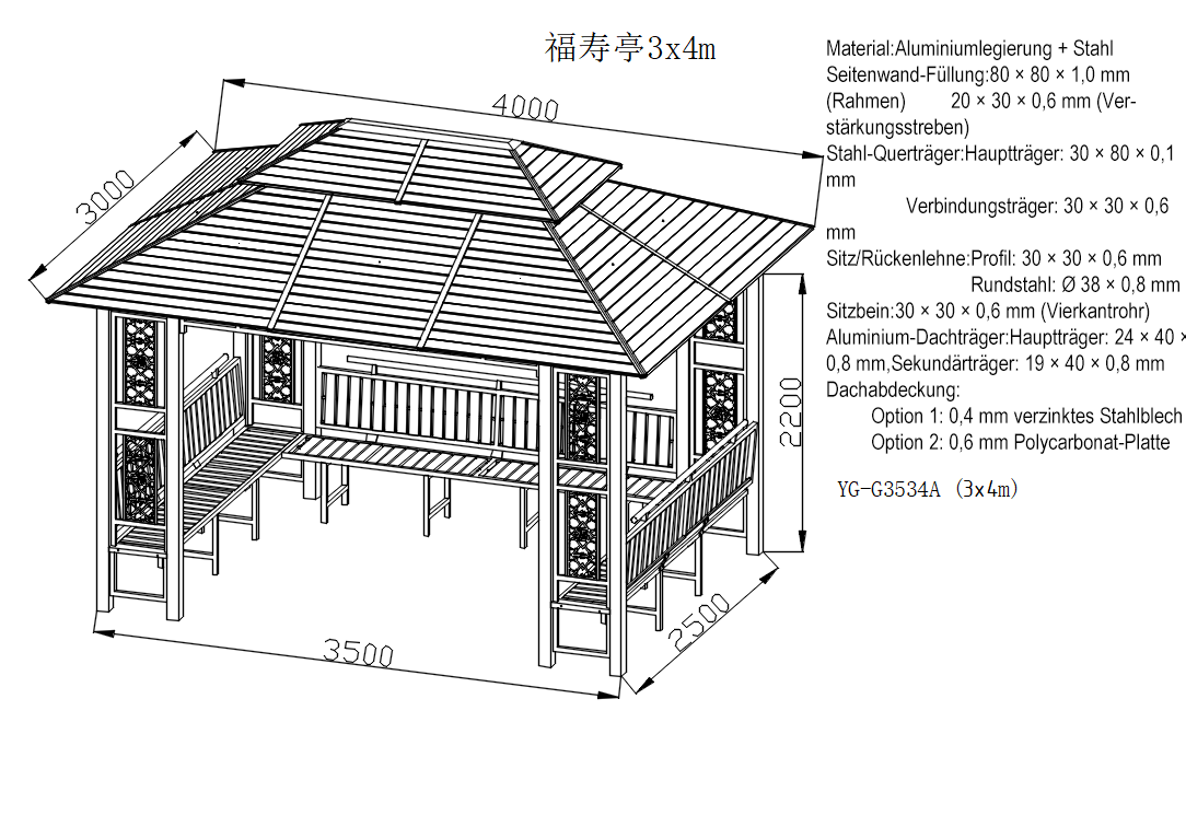 单套全装凉亭(含主体+桌椅)|占地:12㎡ (4×3m)|净重:325kg|承重:结构400kg/桌椅300kg