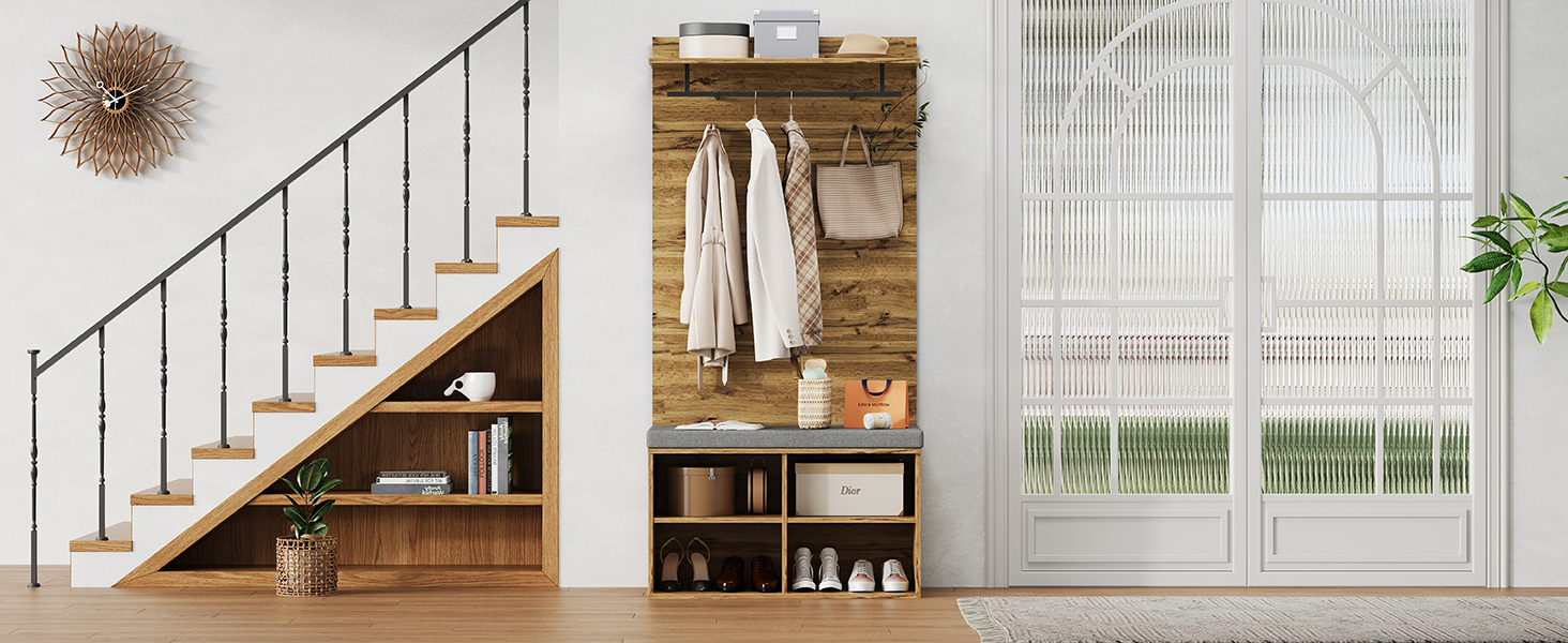 🧥 【强大分区收纳系统】 顶层置物台(承重5kg)放包帽饰品;中部稳固挂衣杆挂外套衬衫;两侧附加挂钩挂钥匙雨伞;底部可调节层板自由定制高度,轻松收纳高帮靴或鞋盒。