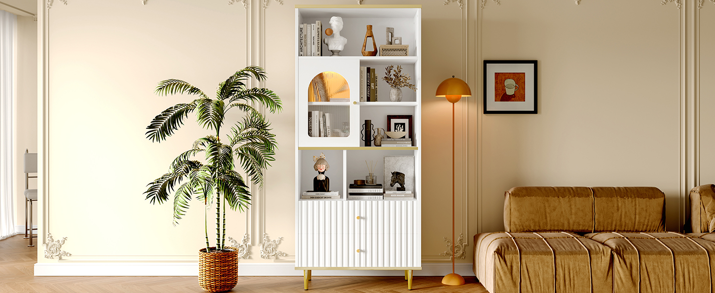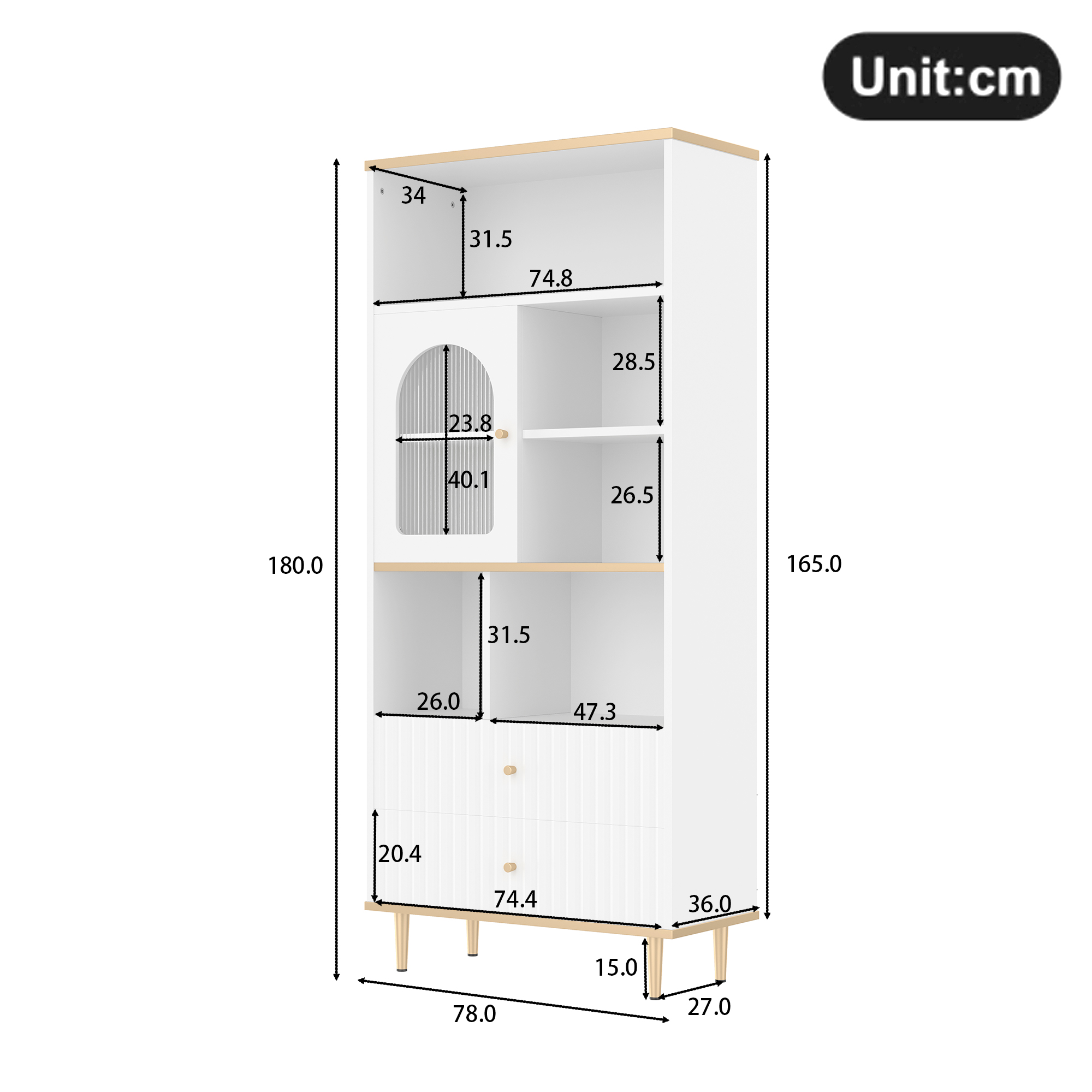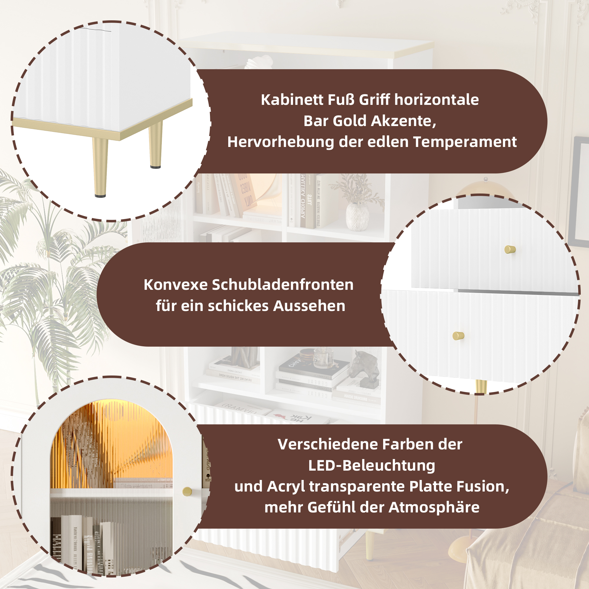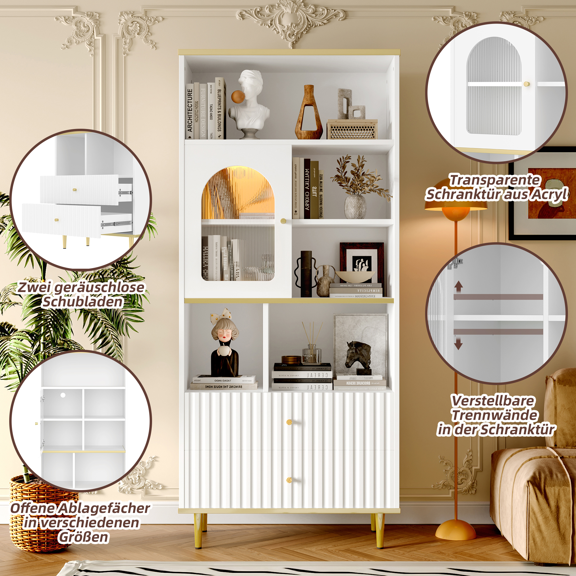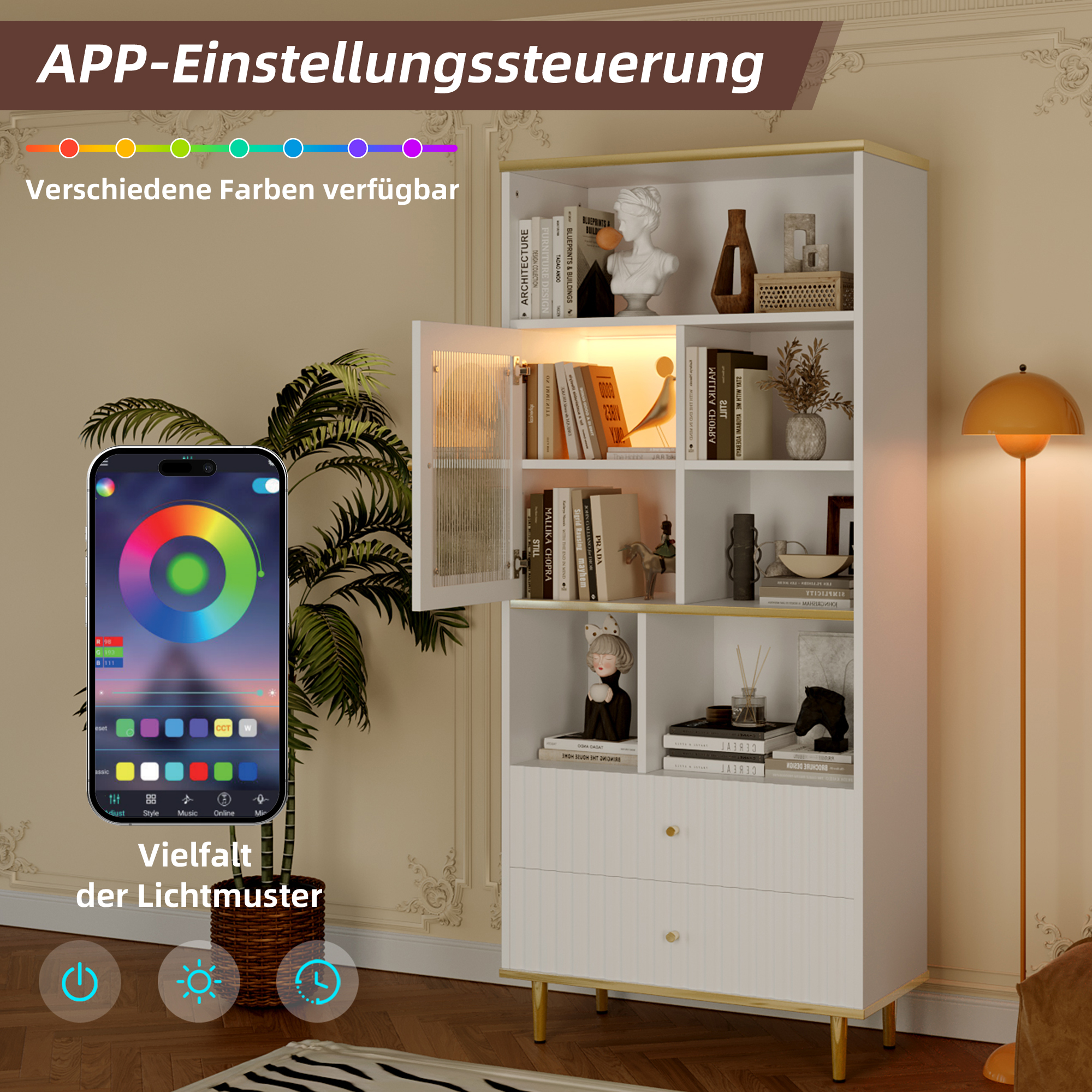 智能书架带LED灯条 180cm高玻璃门书柜 遥控变色RGB光效+静音抽屉 多功能展示架置物架 适用于客厅卧室电竞房 白色