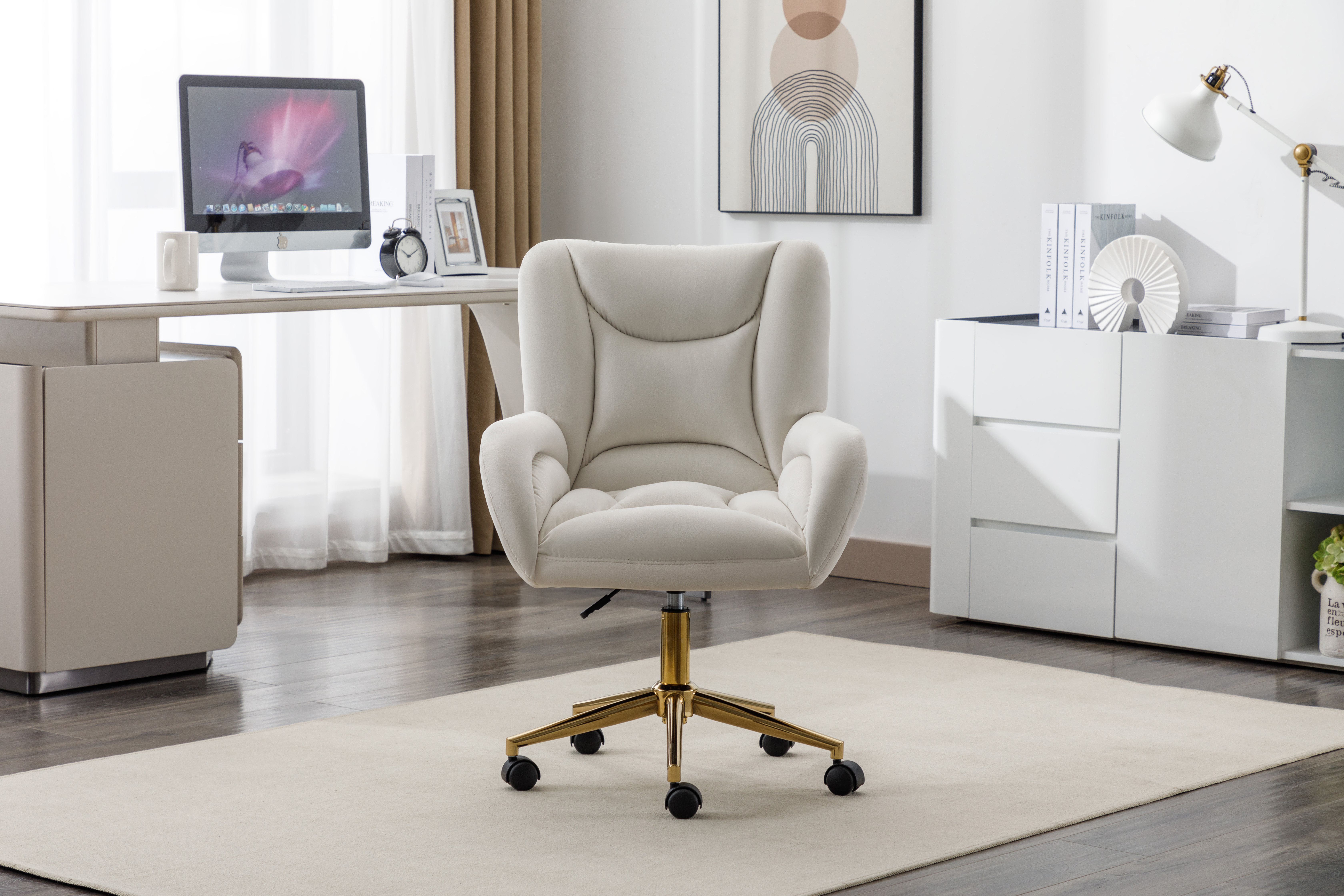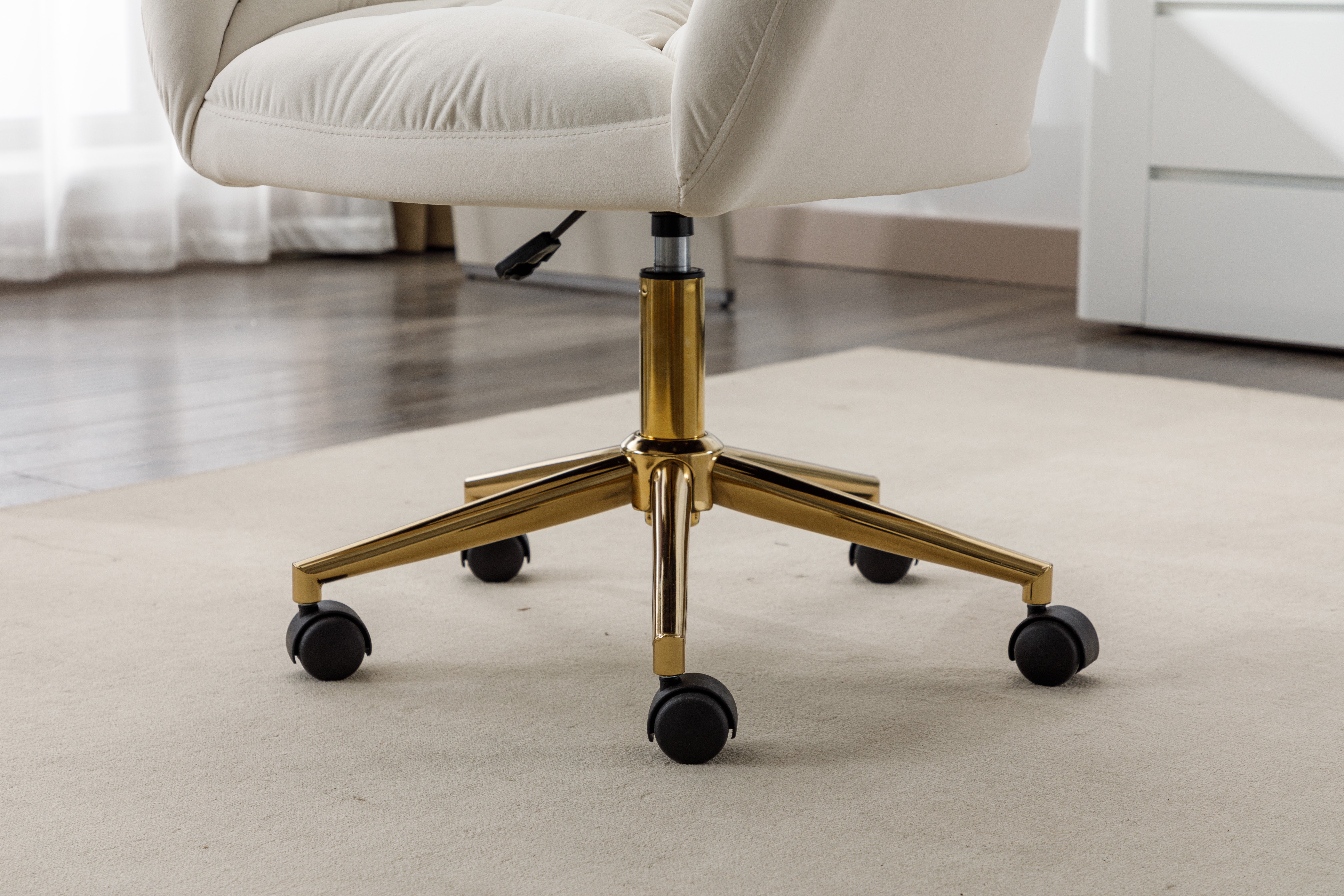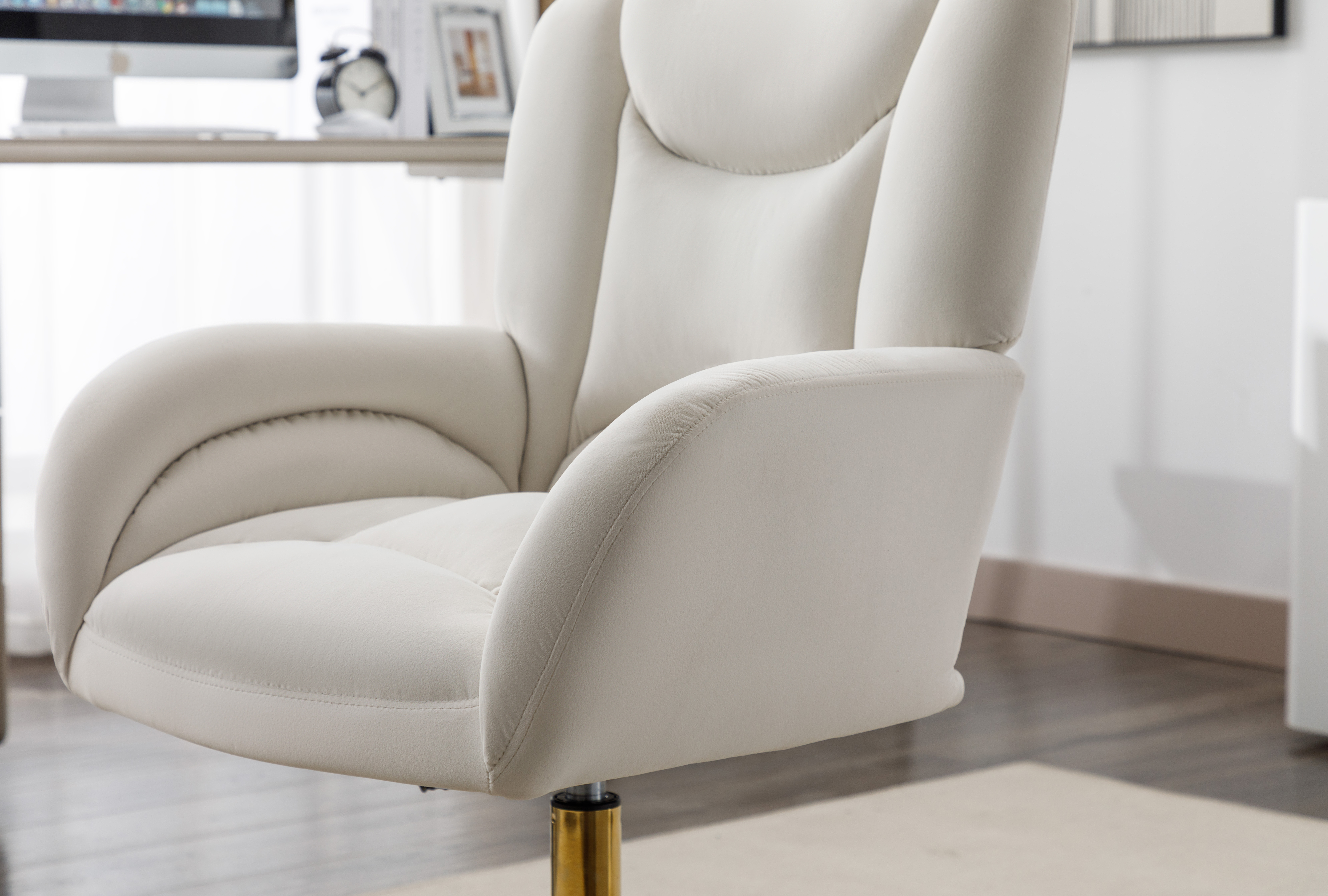 轻奢天鹅绒办公椅 金色脚升降电脑椅 家用书桌椅主播椅 象牙白绒布书房座椅 带滚轮可滑动 舒适久坐