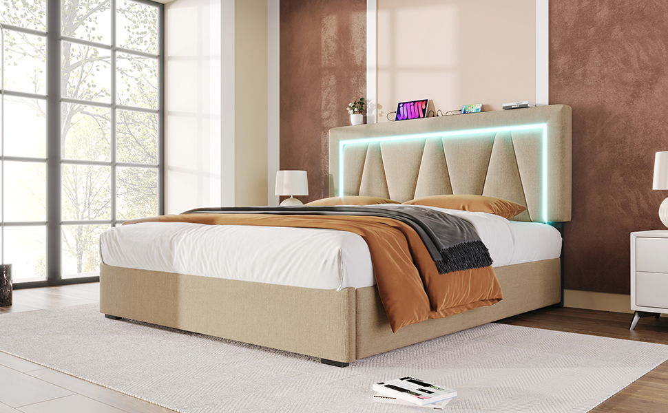 您可以在睡前靠在床头,调节最舒适的高度阅读或观影,手机直接连接床头的Type-C或USB接口快速充电,无需下床寻找充电器。内置的LED灯带可通过遥控器改变颜色、亮度和模式,为您打造专属的放松或睡眠环境。强大的储物功能解决了小户型空间的收纳难题,让您的卧室始终保持整洁清爽。
