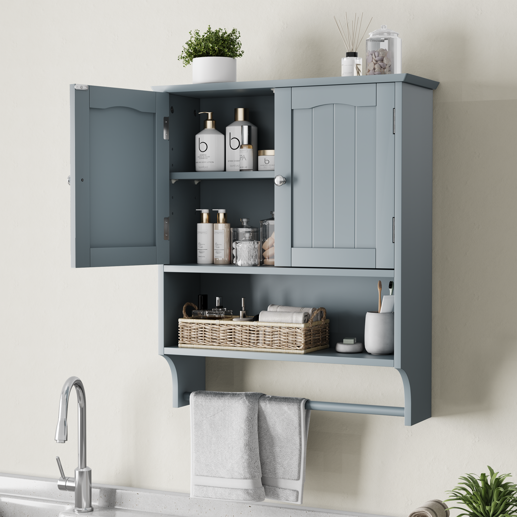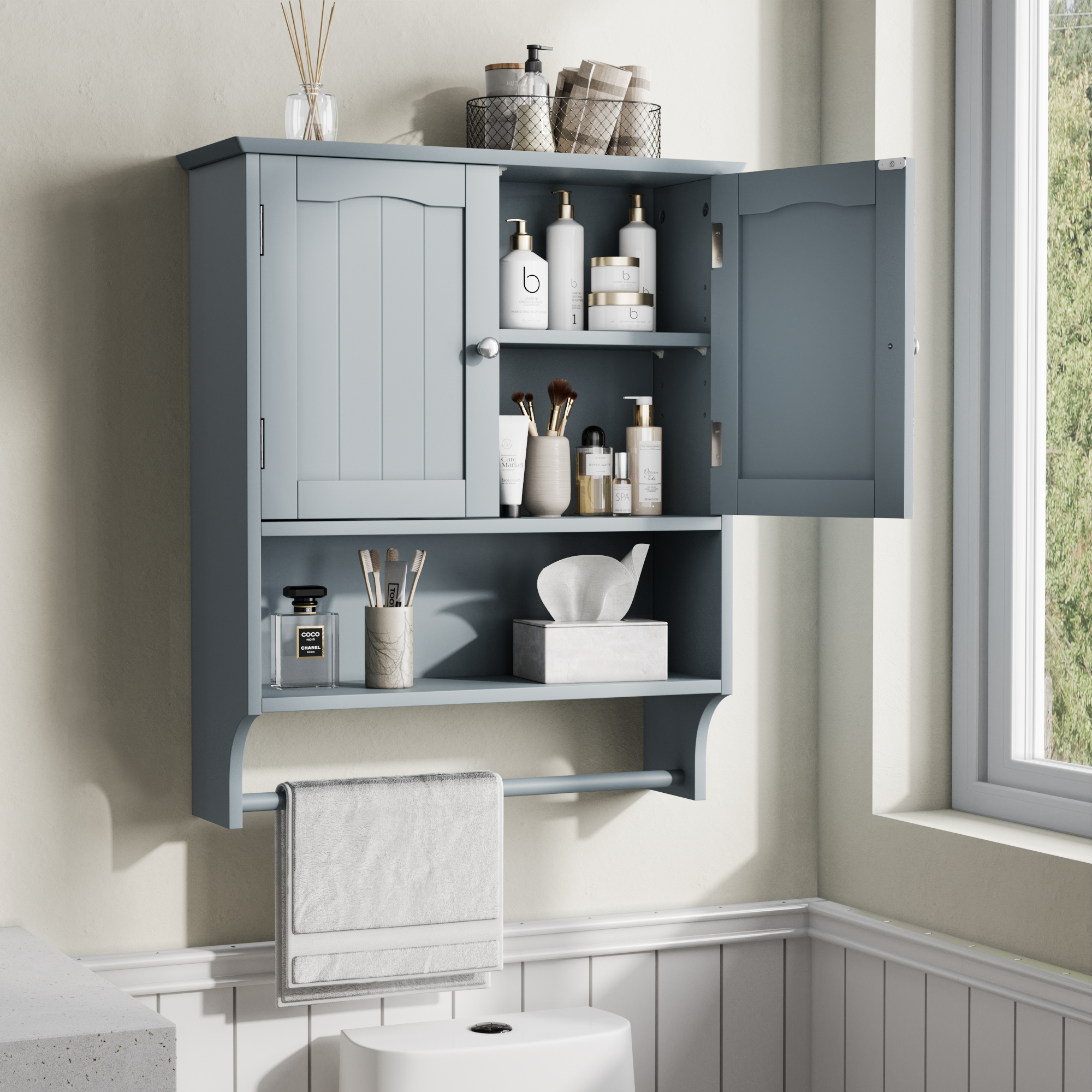 浴室壁挂柜带毛巾架 浅灰色双门镜柜 马桶上方置物架 带3层开放格 防水浴室收纳柜 卫生间储物柜