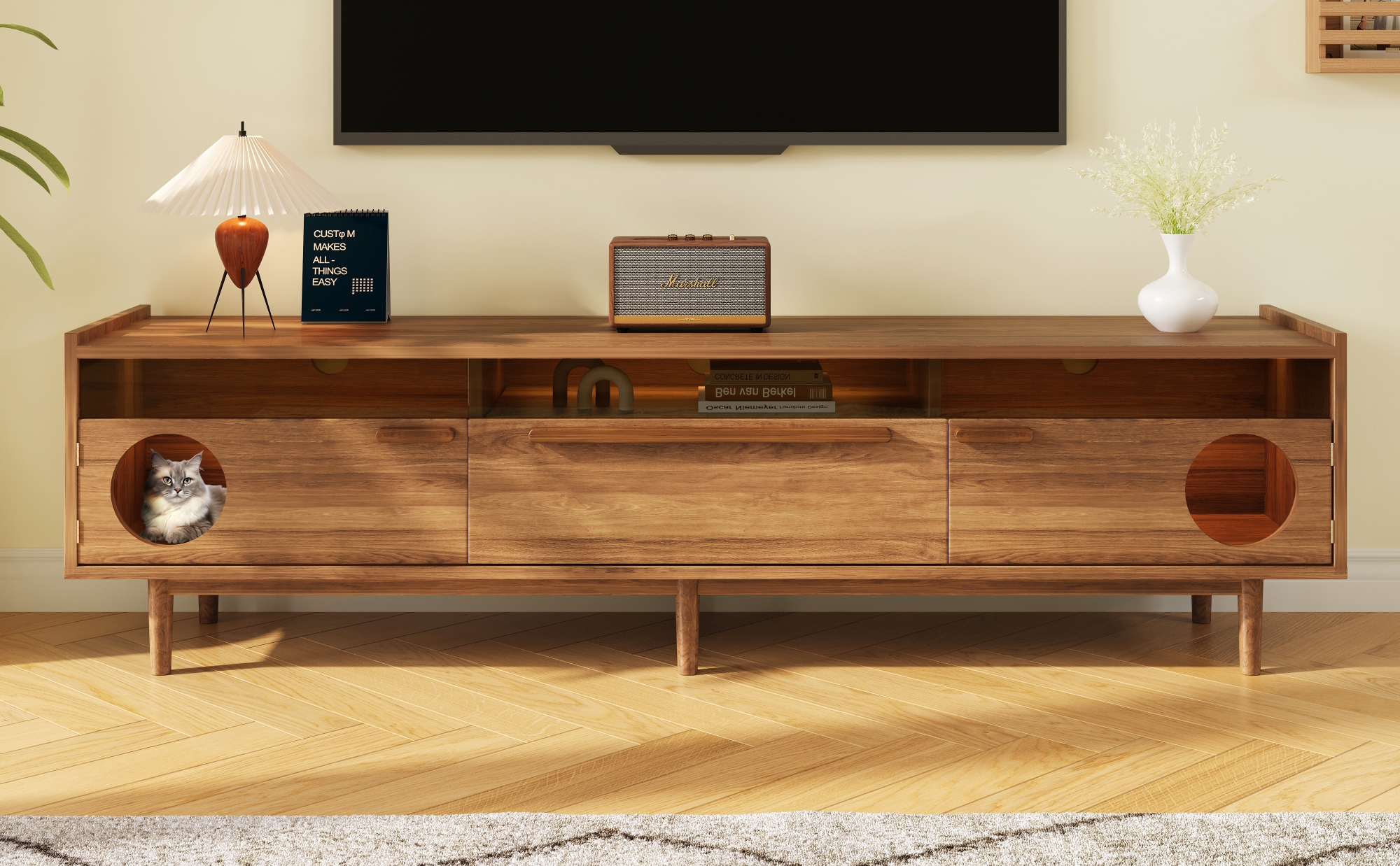 ● 一柜两用,人宠同乐:不仅是时尚的媒体柜,更是爱猫专属的私密休憩房。双门均设有入口,让猫咪自由探索,轻松融入您的家居生活。