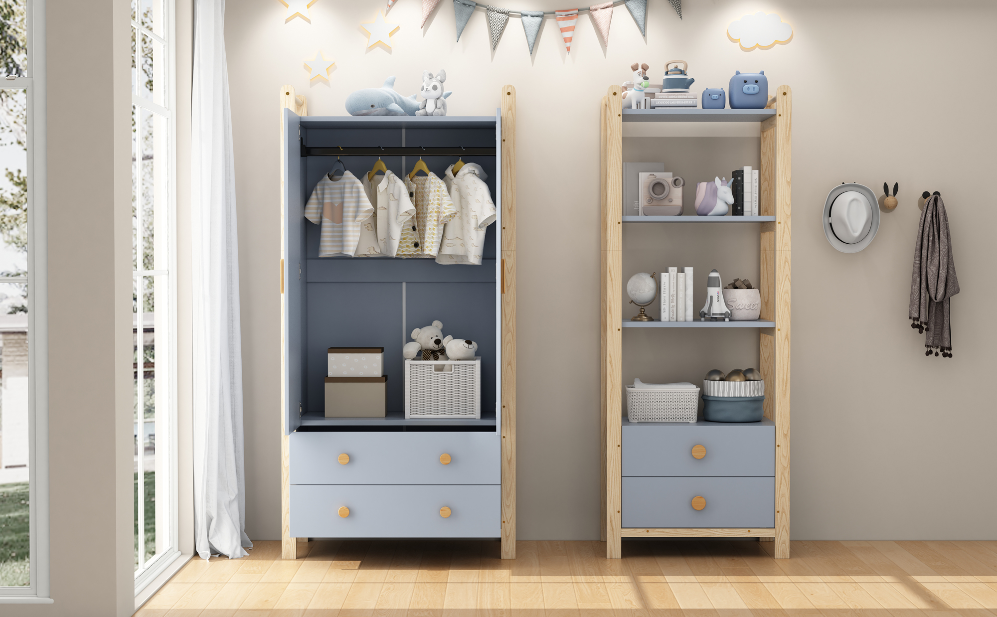 精致细节,安全贴心: 实木圆角把手设计,圆润光滑,防止磕碰,呵护家人安全。清新的蓝色与自然原木色碰撞,为家居环境注入一抹活泼与现代的气息。