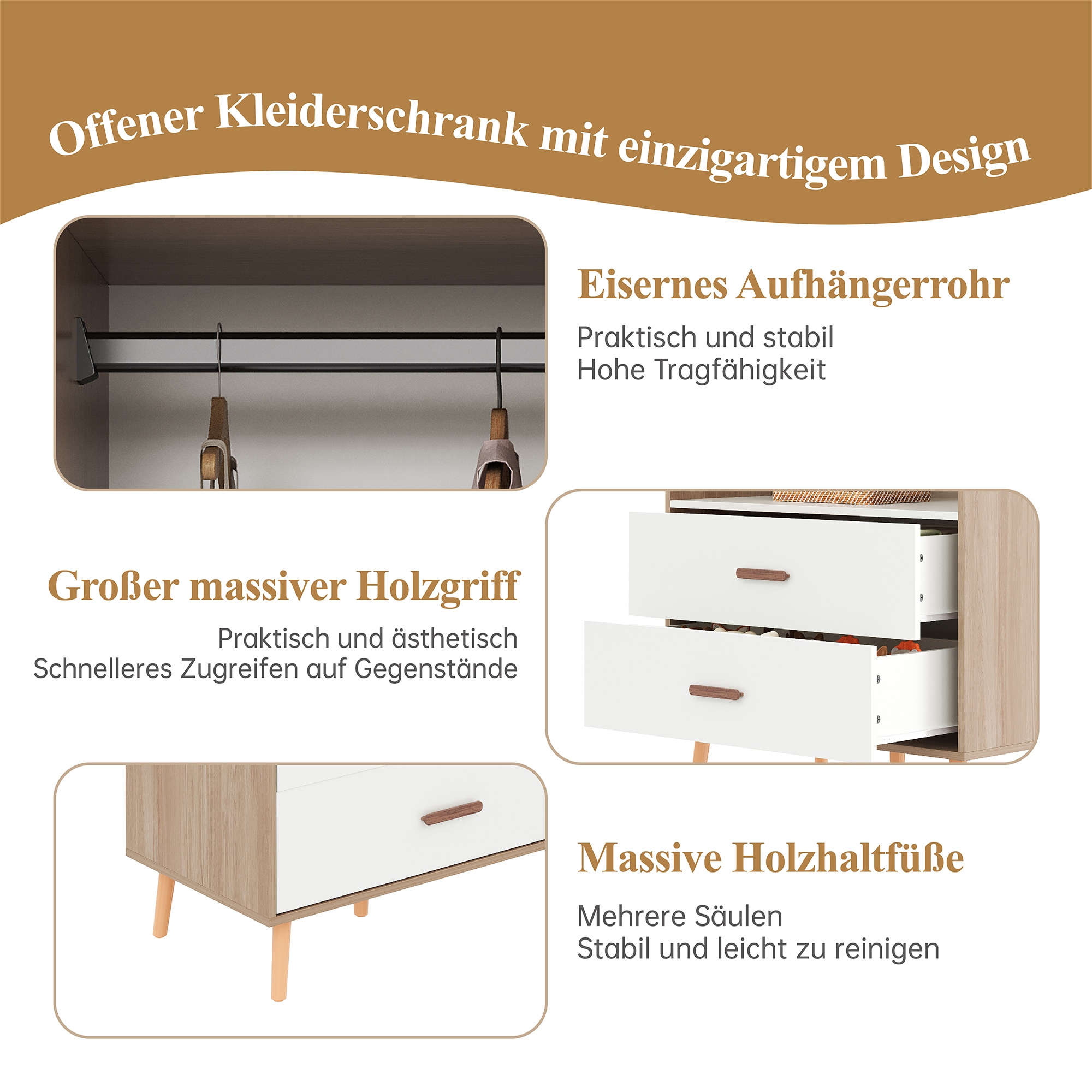 告别杂乱,拥抱整洁!这款现代风开放式衣柜,巧妙融合了开放式挂衣区和密闭抽屉收纳,为您和孩子提供一个一目了然、取用便捷的衣物管理方案。其优雅的白木配色与精致细节,能为任何房间注入一抹清新与活力。