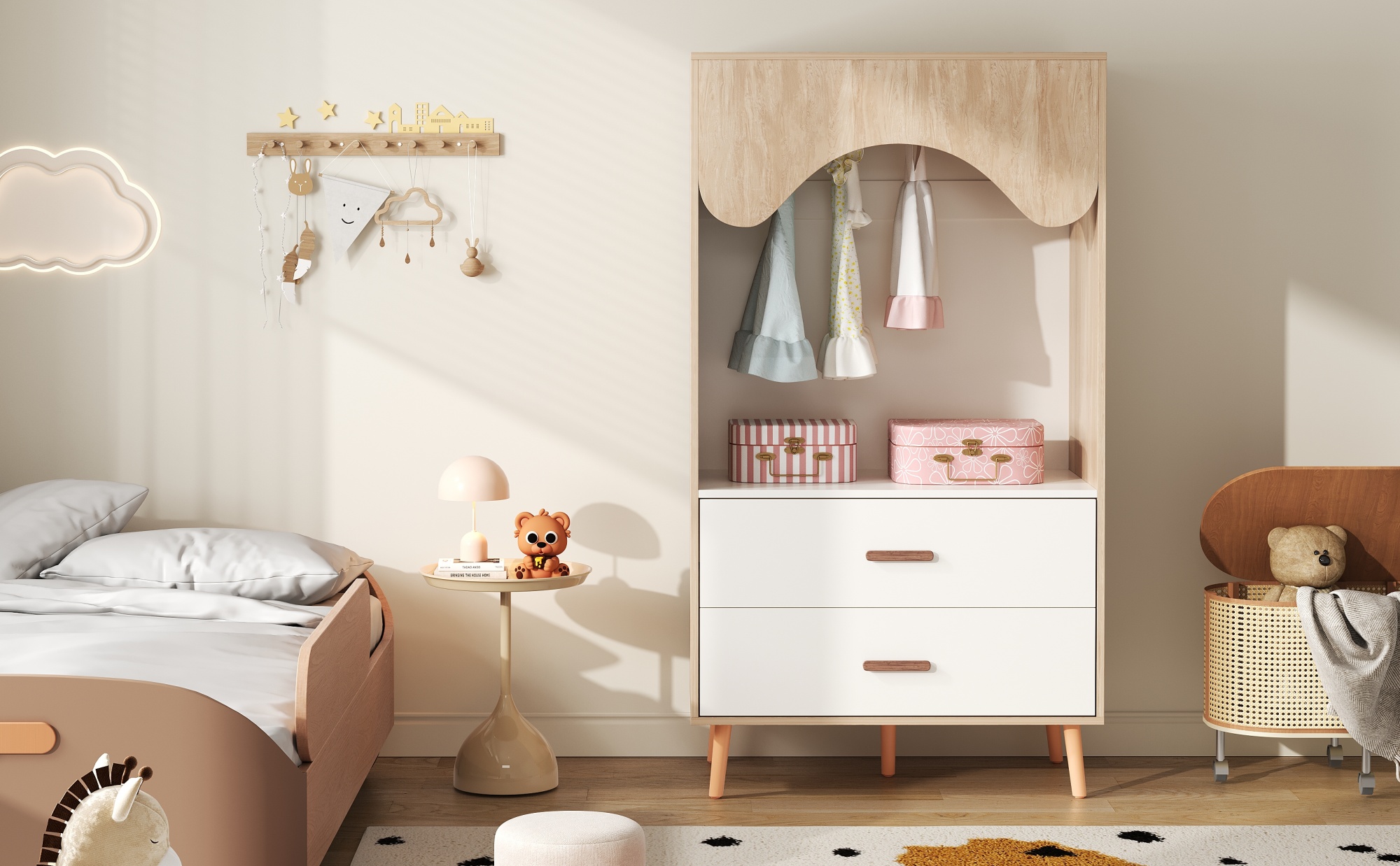 高效分层收纳系统: 设计科学合理。顶部开放式挂衣区配备坚固金属挂杆,方便悬挂外套、衬衫和连衣裙,衣物一目了然,轻松拿取。底部配备两个大容量抽屉,完美收纳袜子、内衣、配饰、玩具等小件物品,让杂乱瞬间隐形,保持空间井井有条。