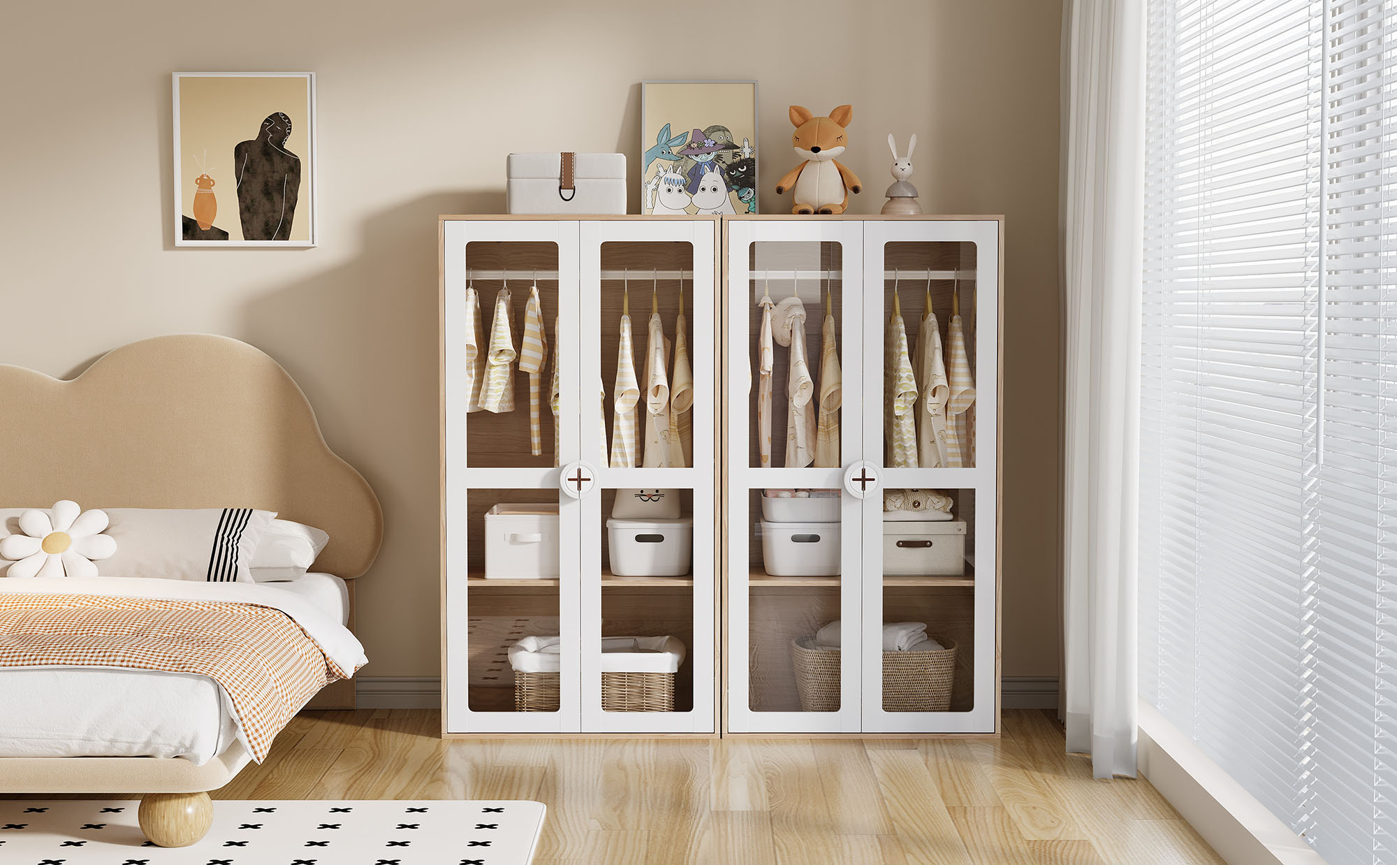 通透玻璃门,一目了然: 双开门采用高强度钢化玻璃,搭配纤细的白色边框,营造出简约通透的视觉美感。孩子无需开门即可快速找到想穿的衣物或心爱的玩具,大大减少了翻找的麻烦,也让房间看起来更加明亮、整洁。