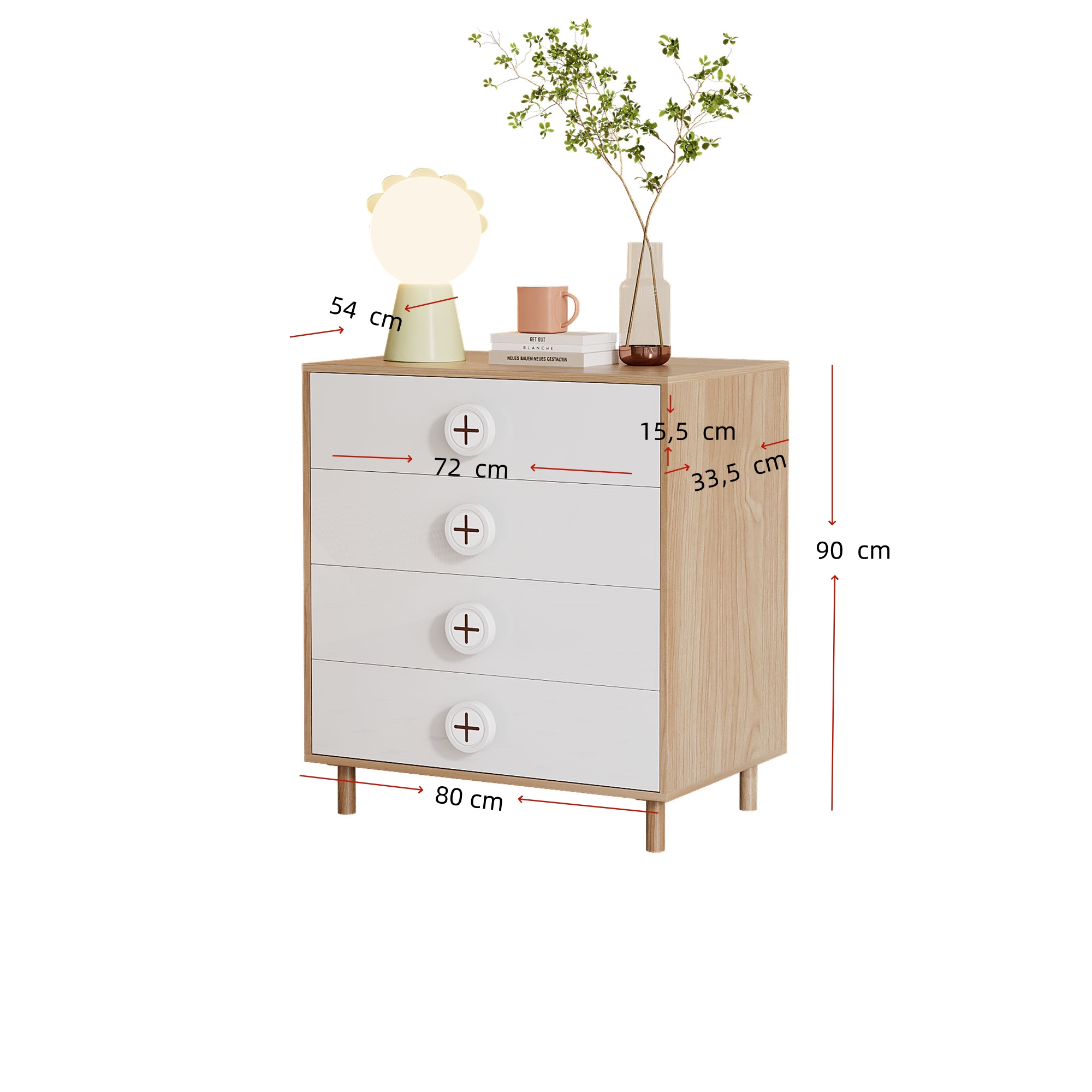 现代简约美学设计: 采用白色漆面面板与自然木色柜体的对比设计,清新时尚。搭配十字造型圆形把手,在简约中注入一丝灵动与趣味,轻松搭配现代、北欧、Ins风等多种家居风格。