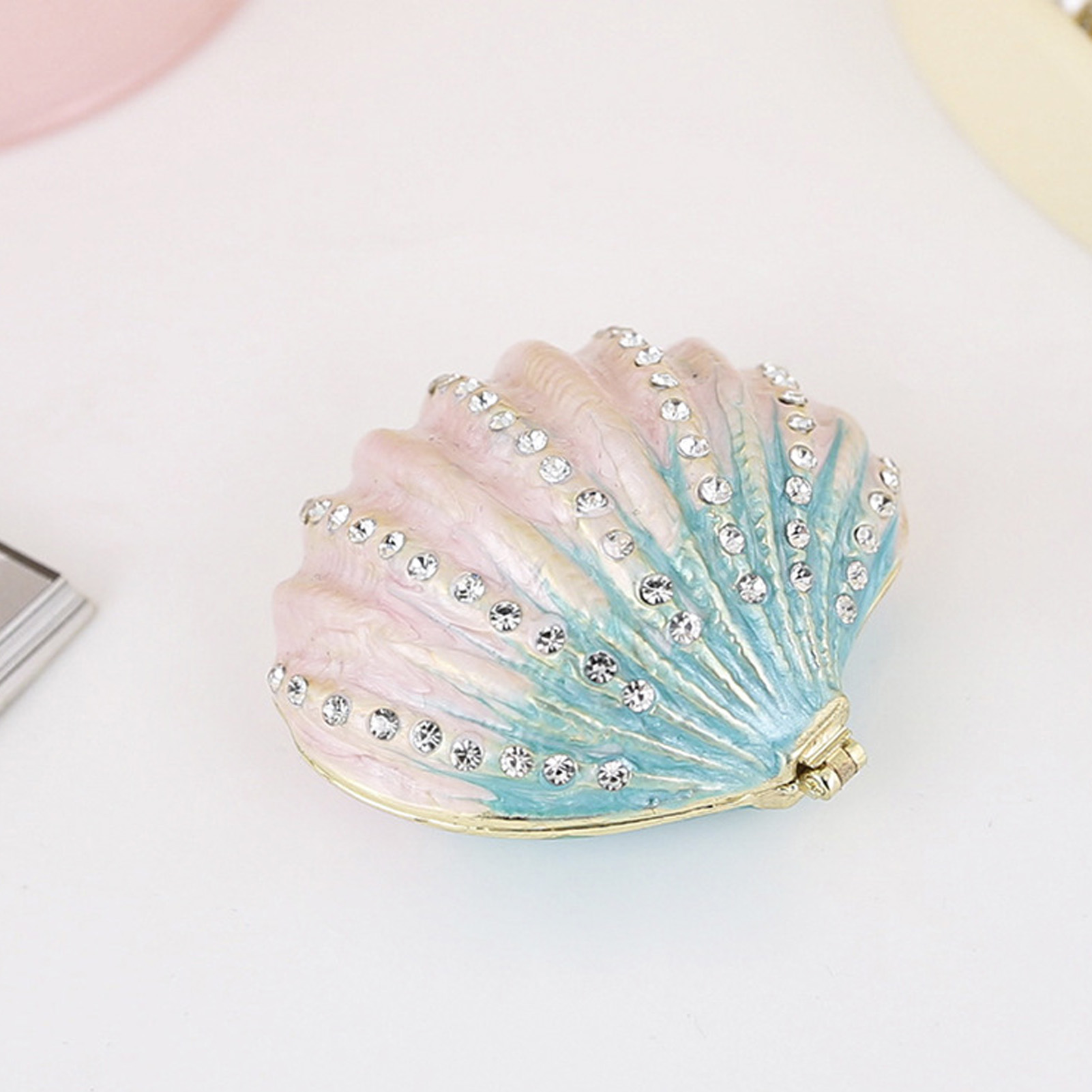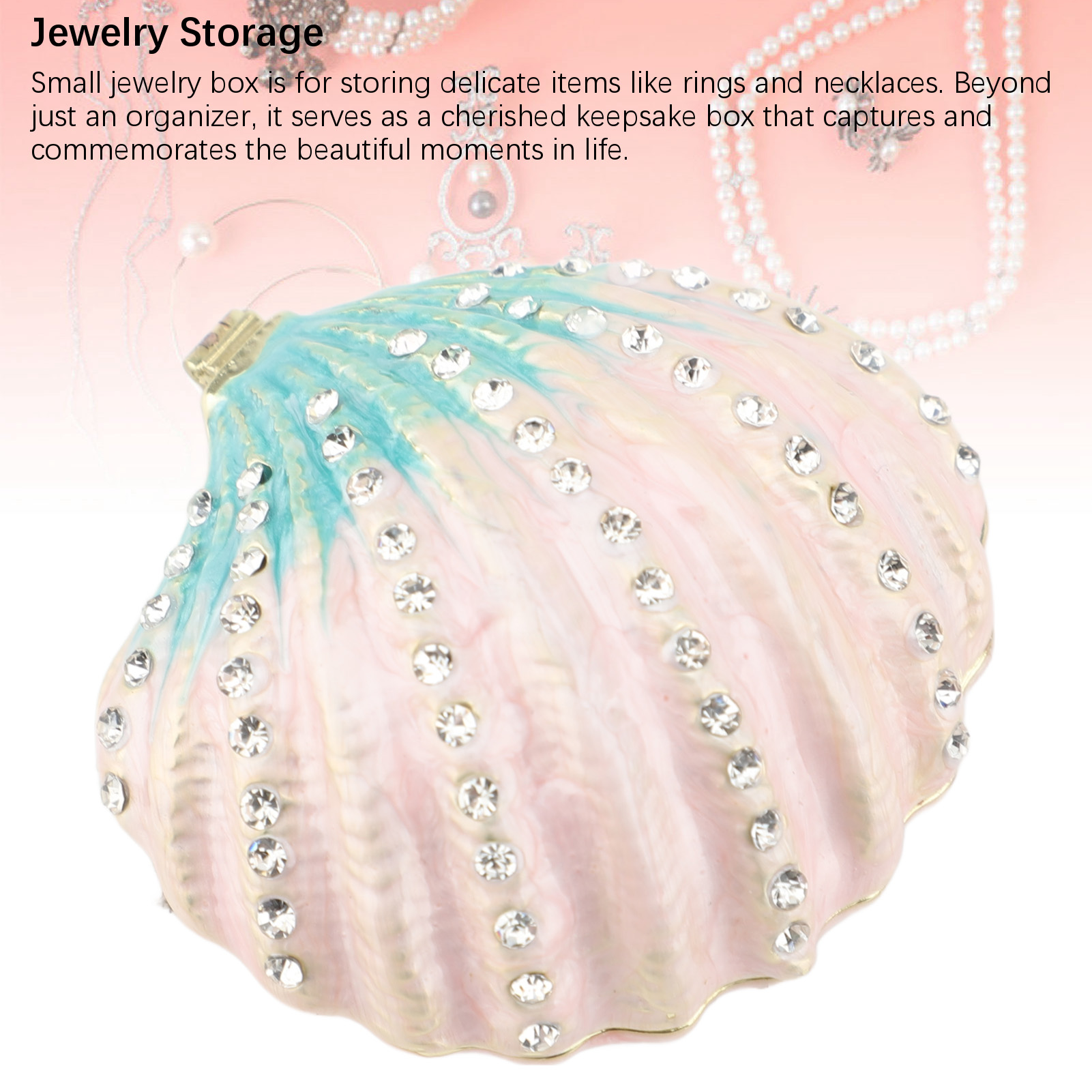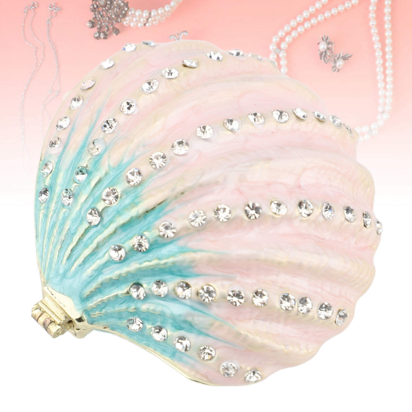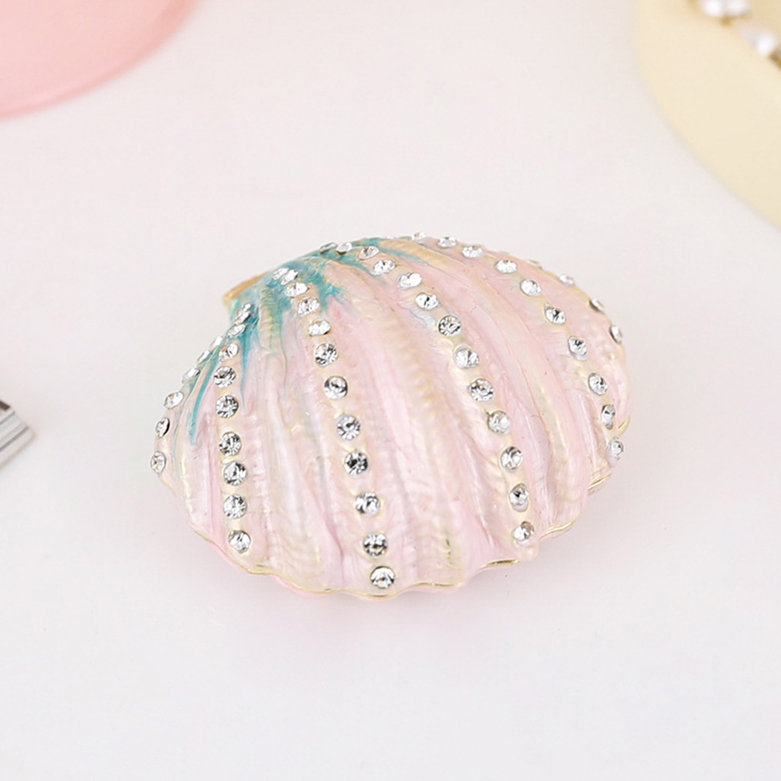 手绘珐琅贝壳首饰盒 粉色合金镶钻铰链珠宝收纳盒 复古桌面装饰摆件 女友生日情人节礼物 (约5.8cm)