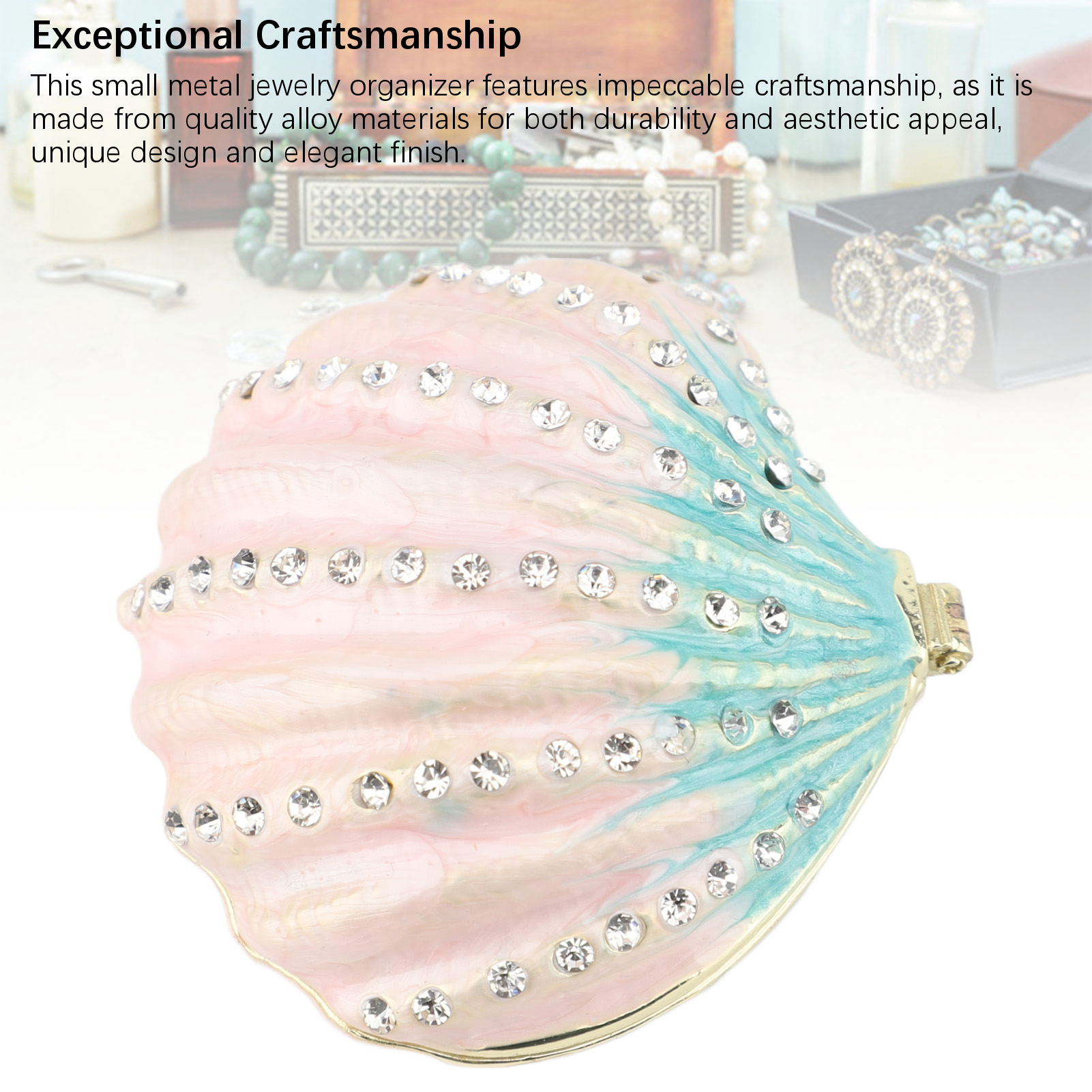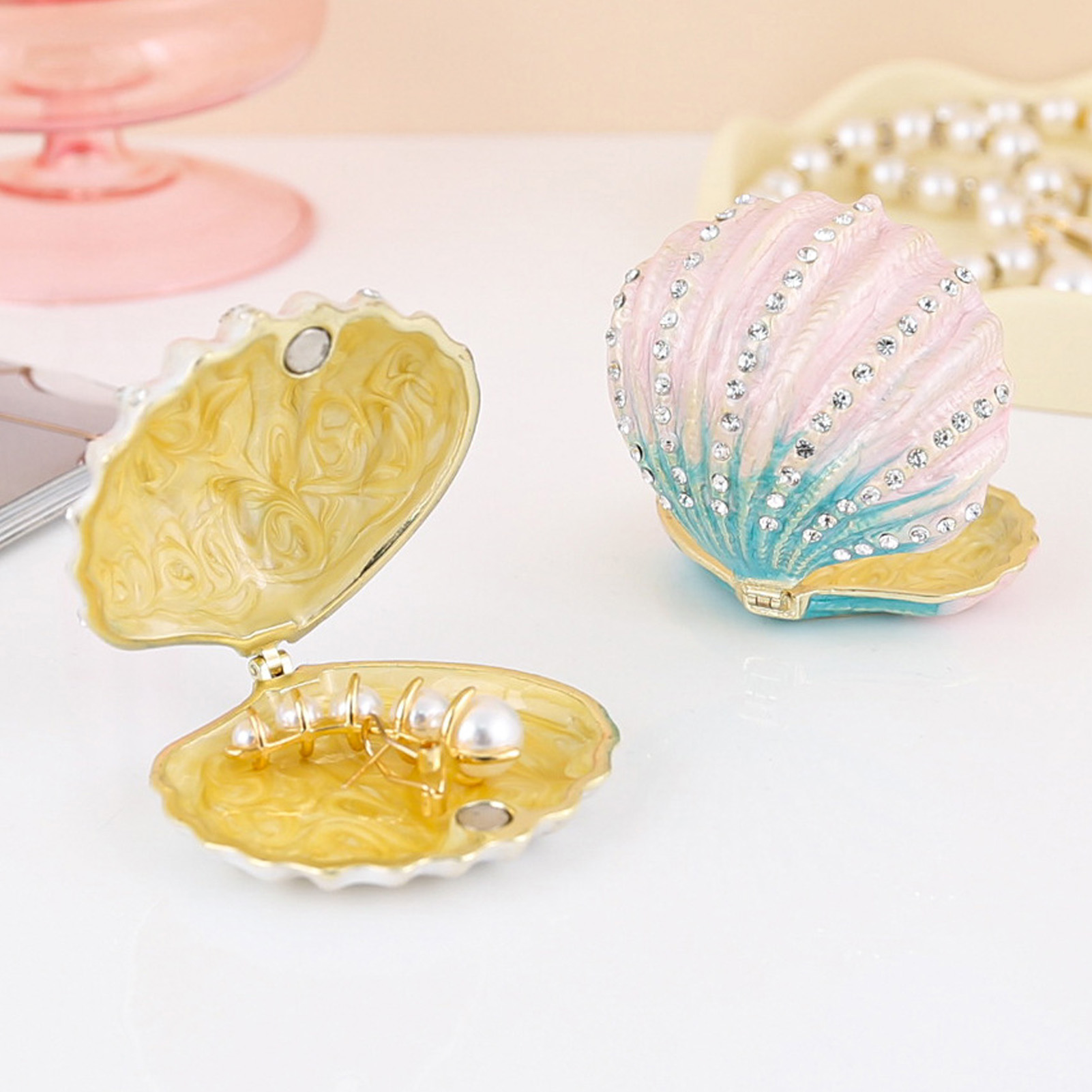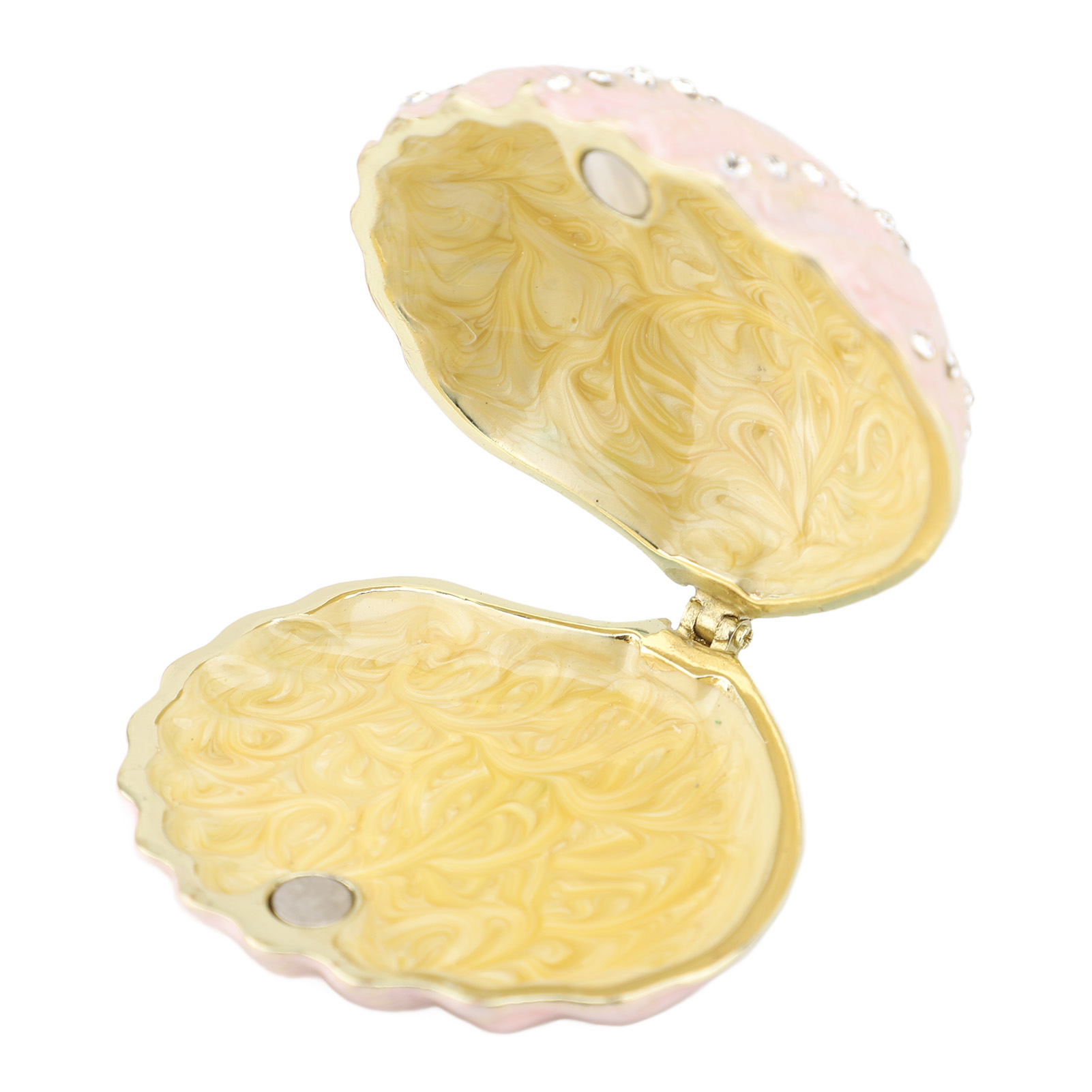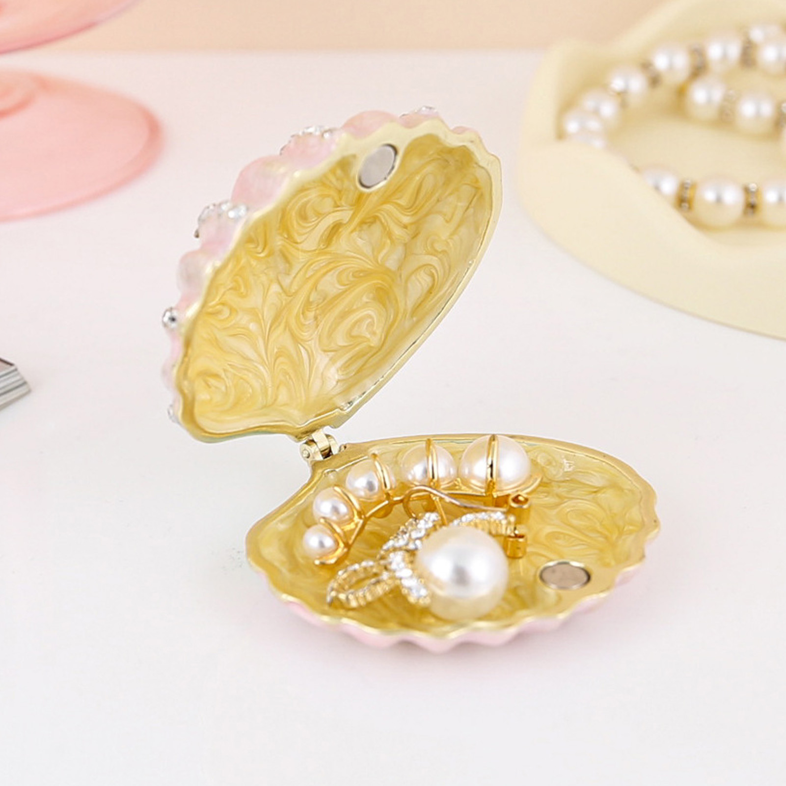 手绘珐琅贝壳首饰盒 粉色合金镶钻铰链珠宝收纳盒 复古桌面装饰摆件 女友生日情人节礼物 (约5.8cm)