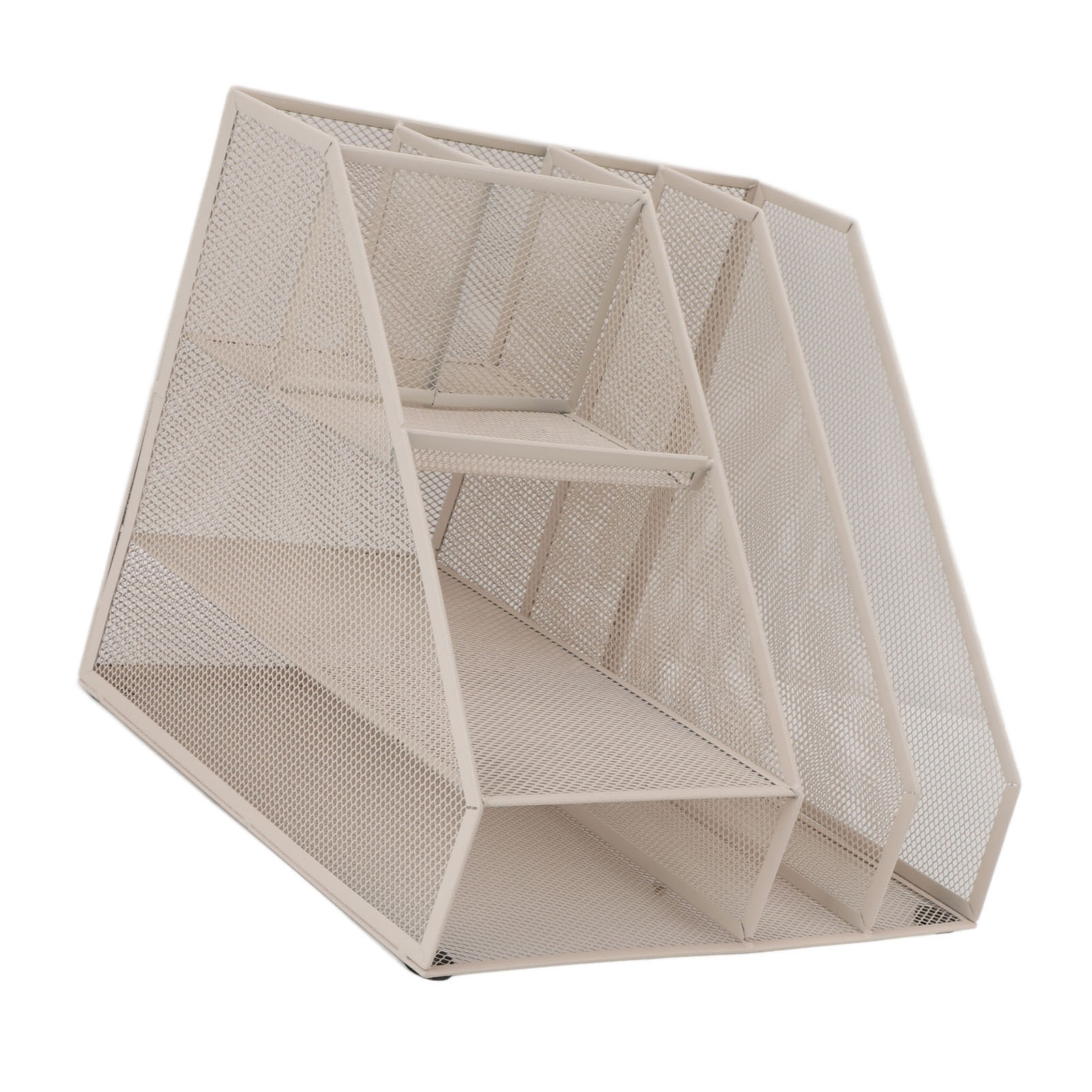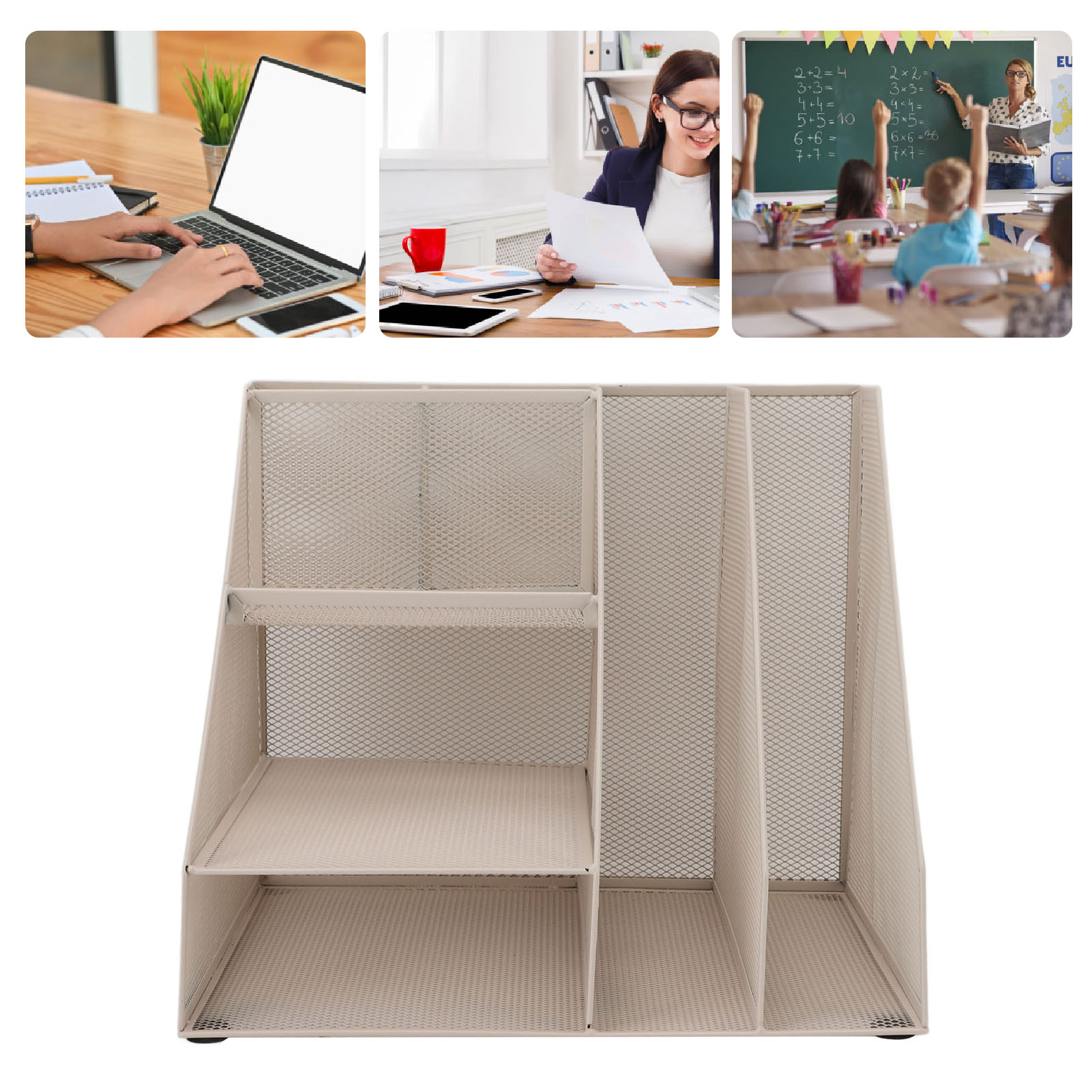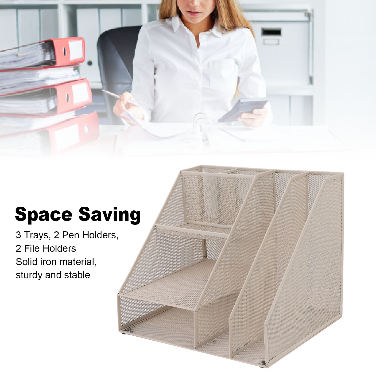 【升级款】白色桌面文件架 两栏三层金属网格资料架 立式A4文件夹书立 带笔筒办公桌收纳盒