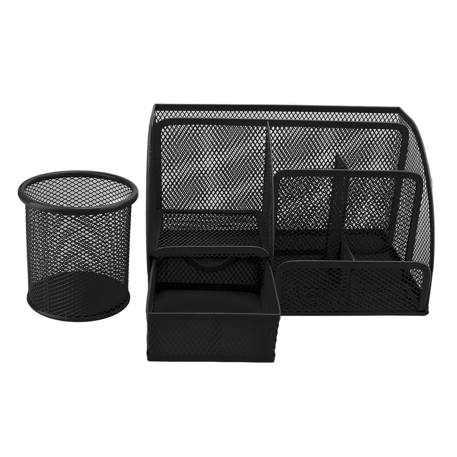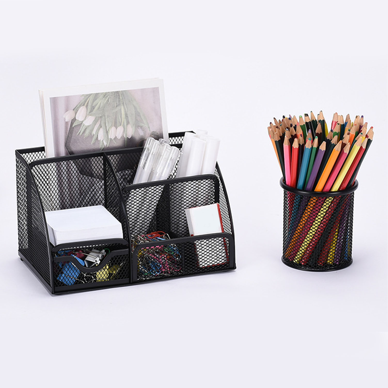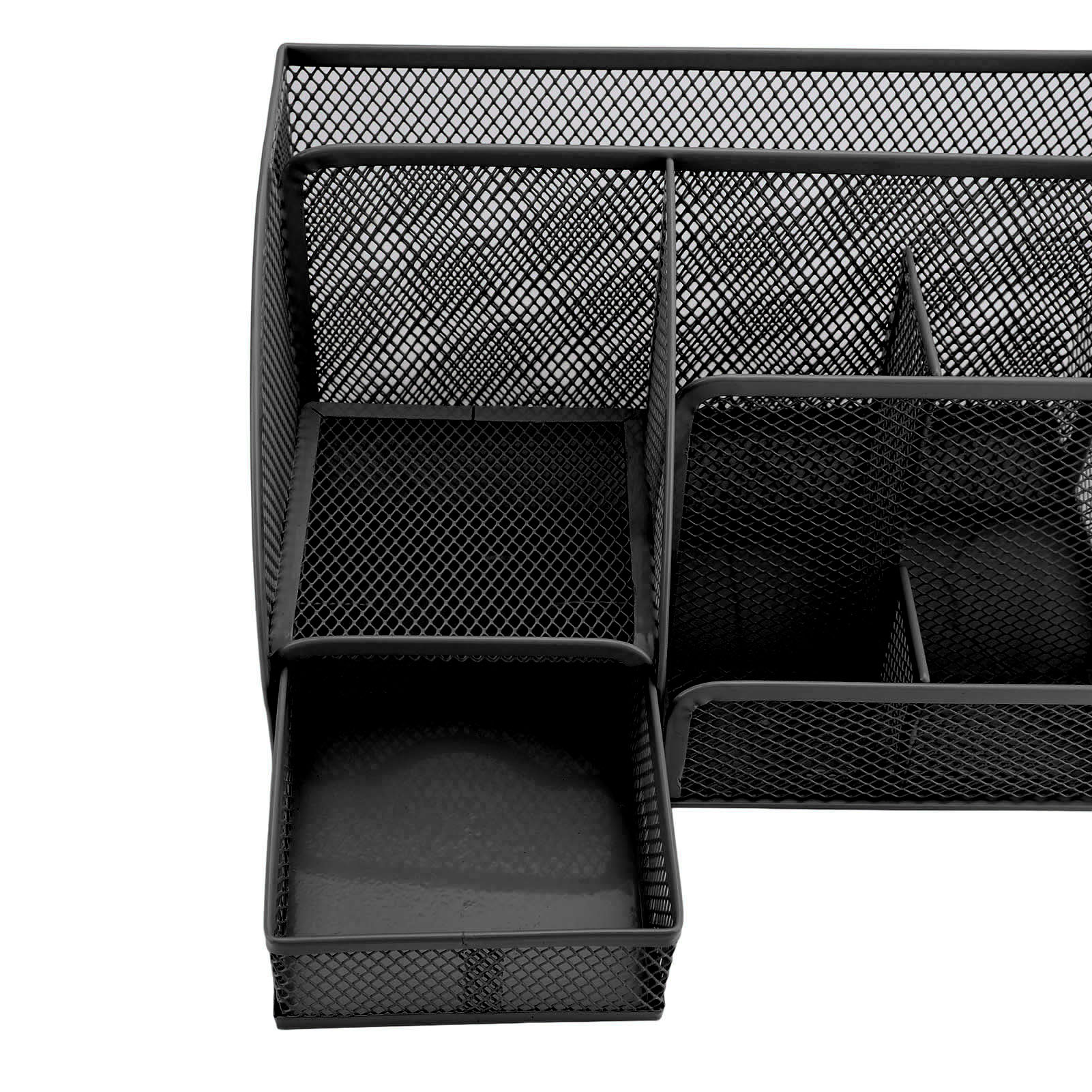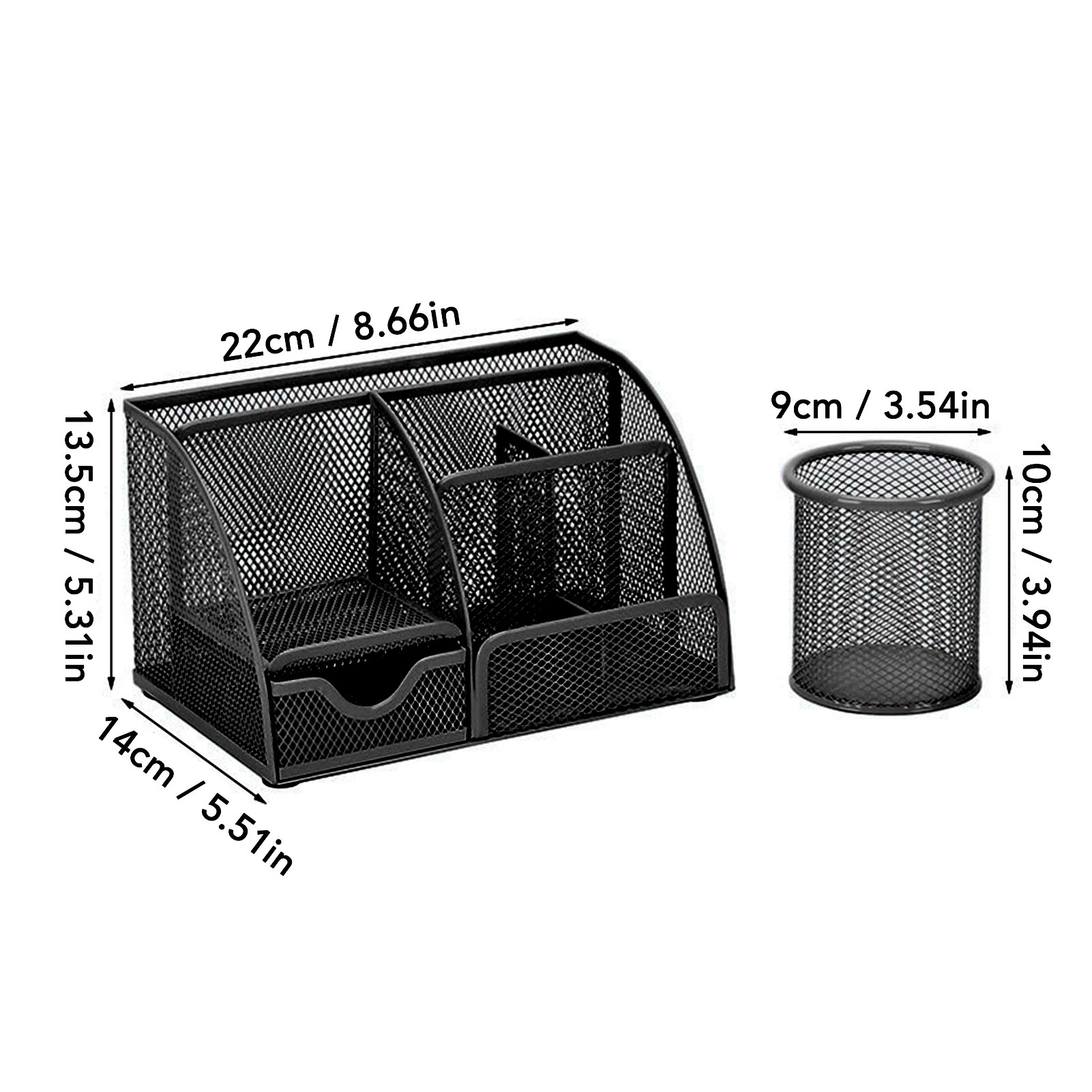 金属网状桌面收纳盒带抽屉 七格笔筒+圆形笔架 多功能文具办公用品收纳架 适用于办公室家庭学校 防刮底座 黑色