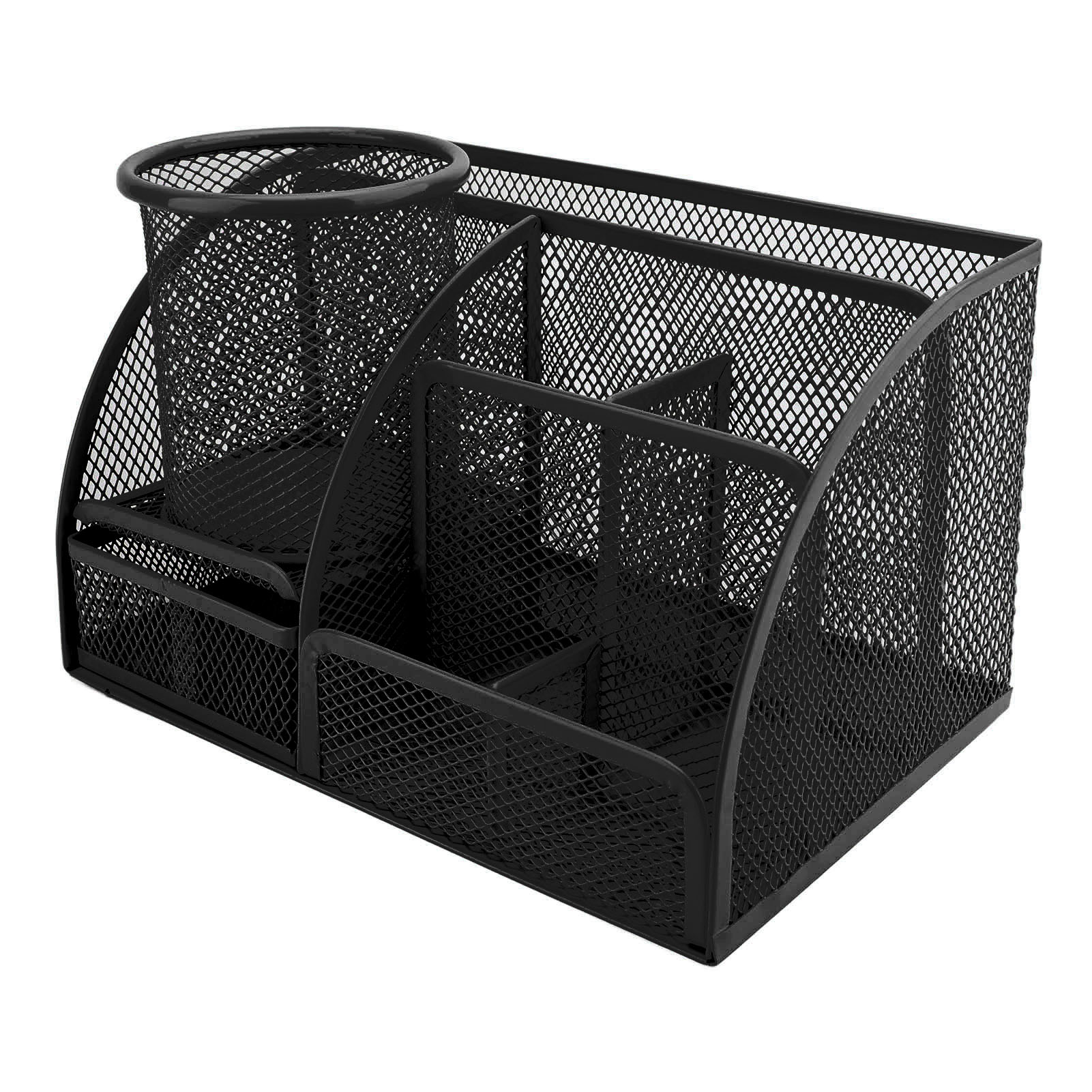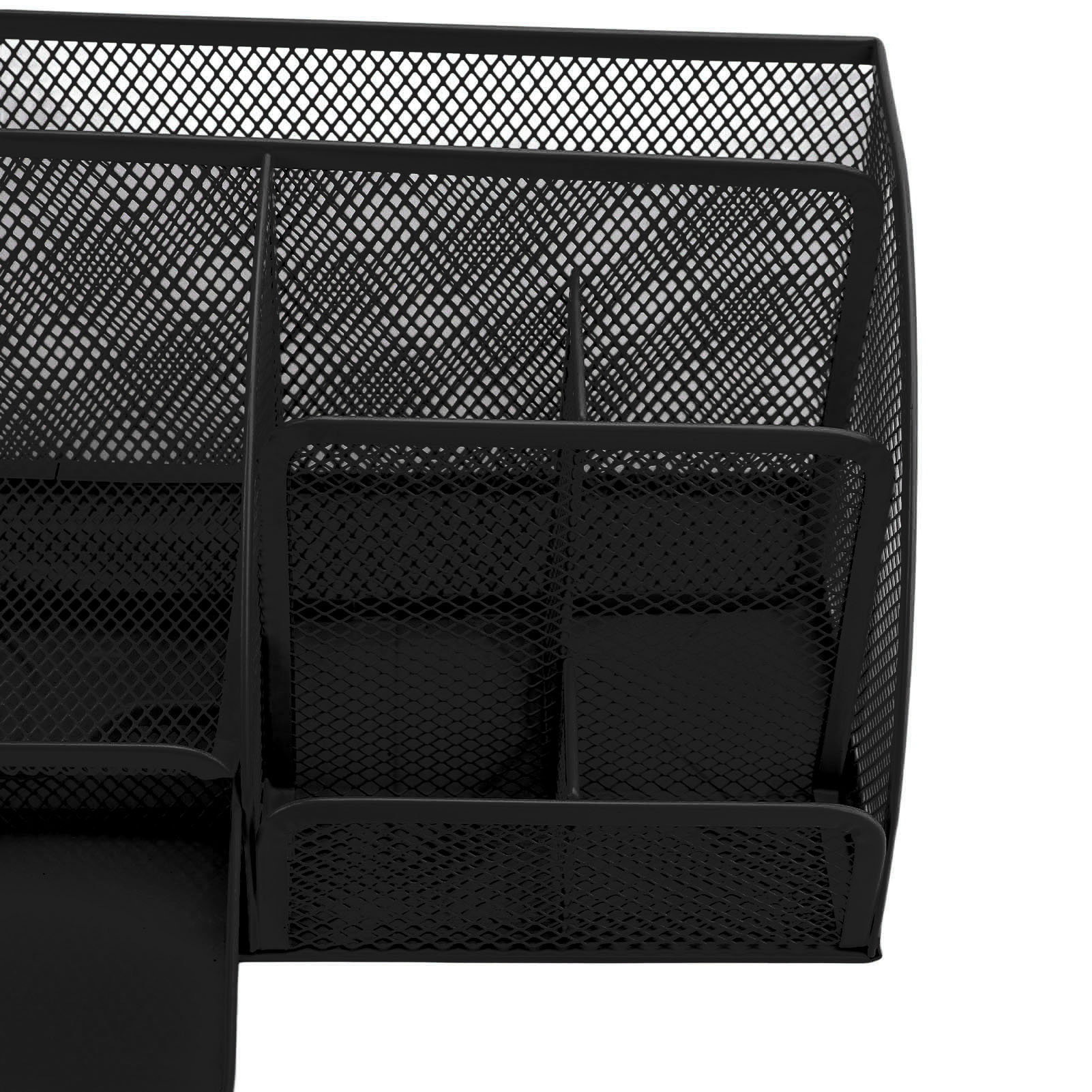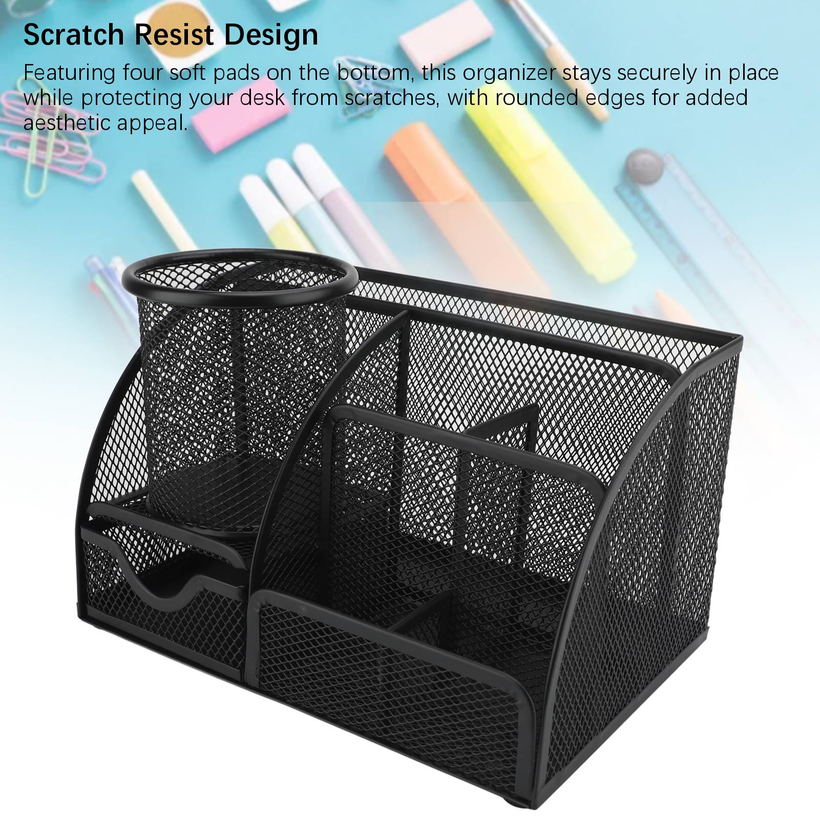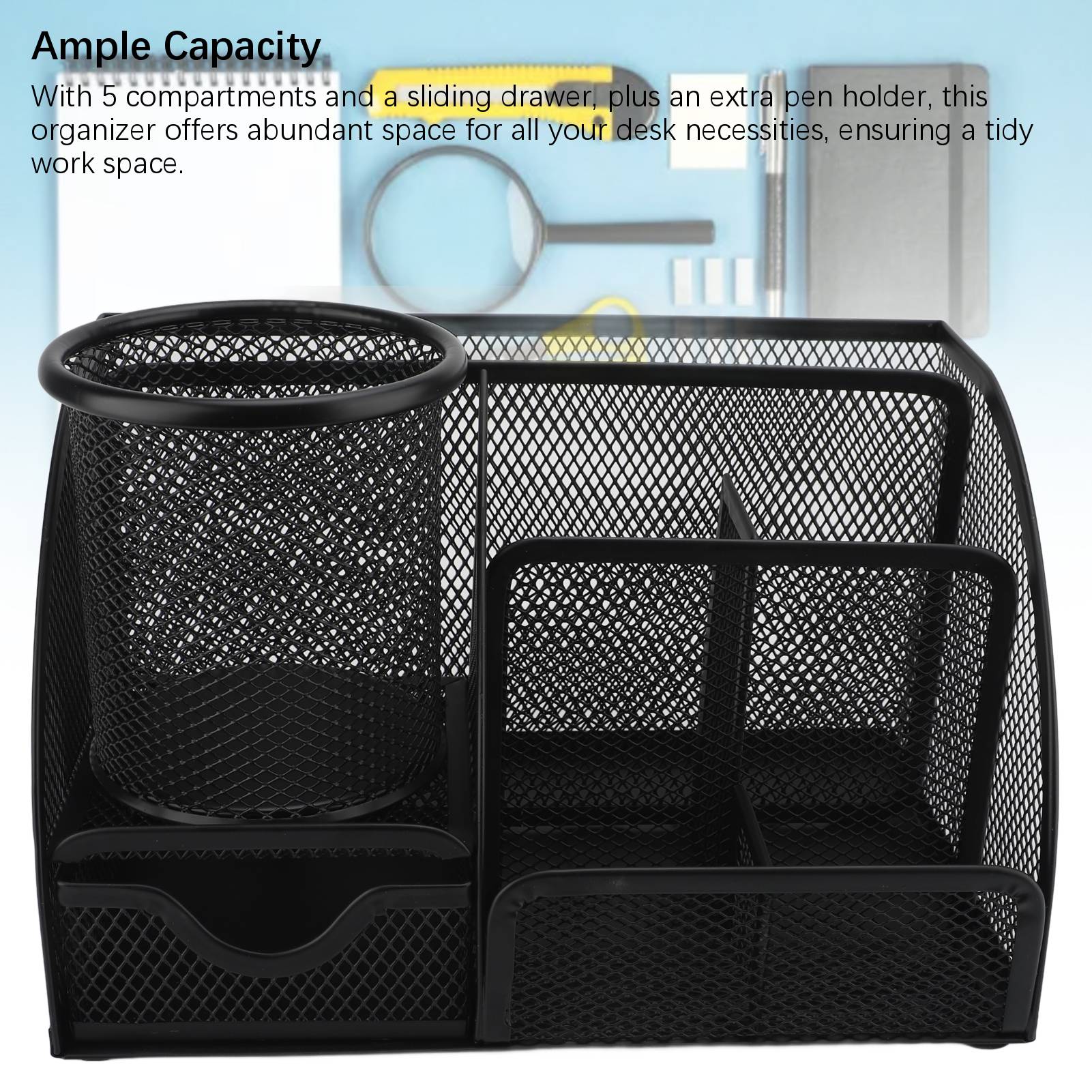 金属网状桌面收纳盒带抽屉 七格笔筒+圆形笔架 多功能文具办公用品收纳架 适用于办公室家庭学校 防刮底座 黑色