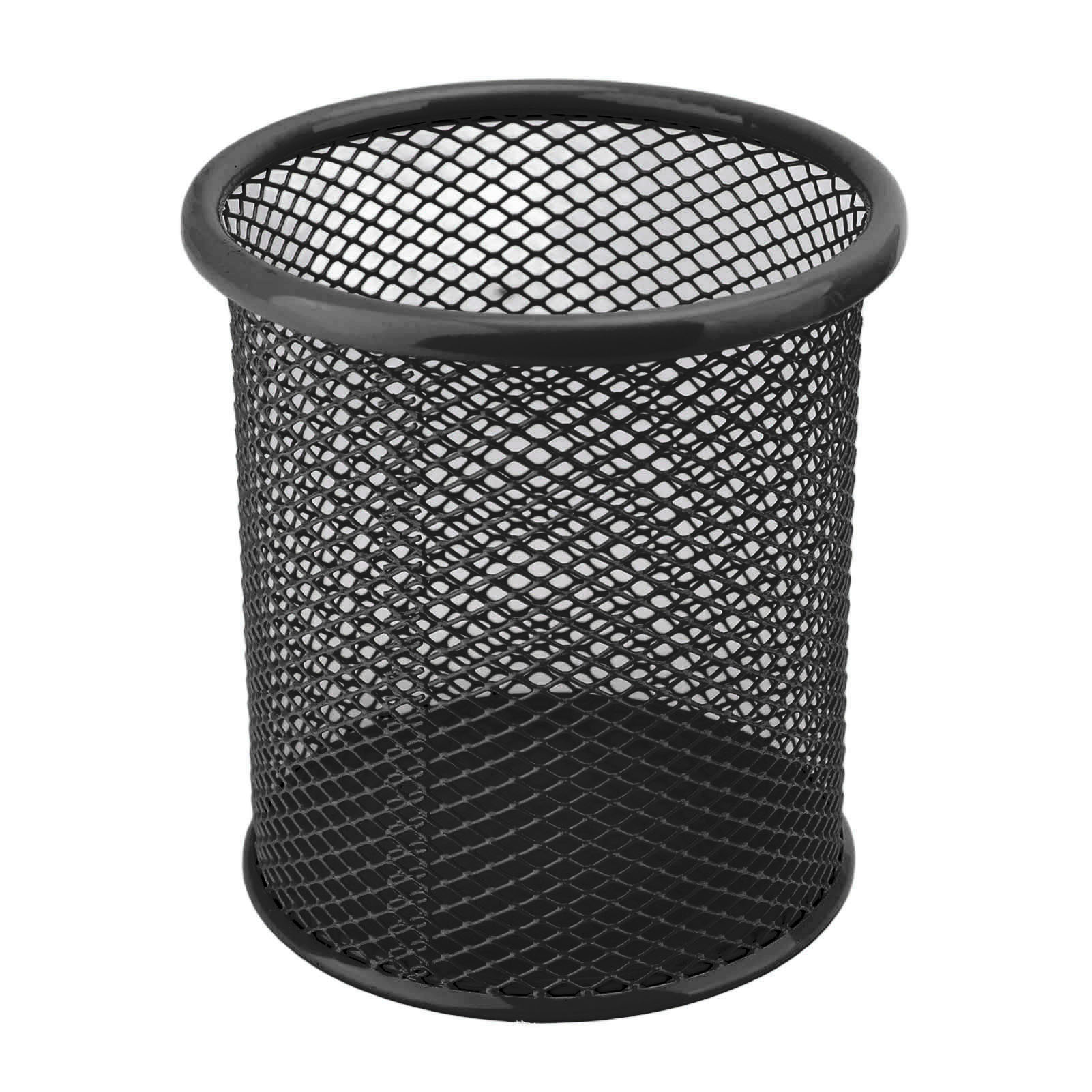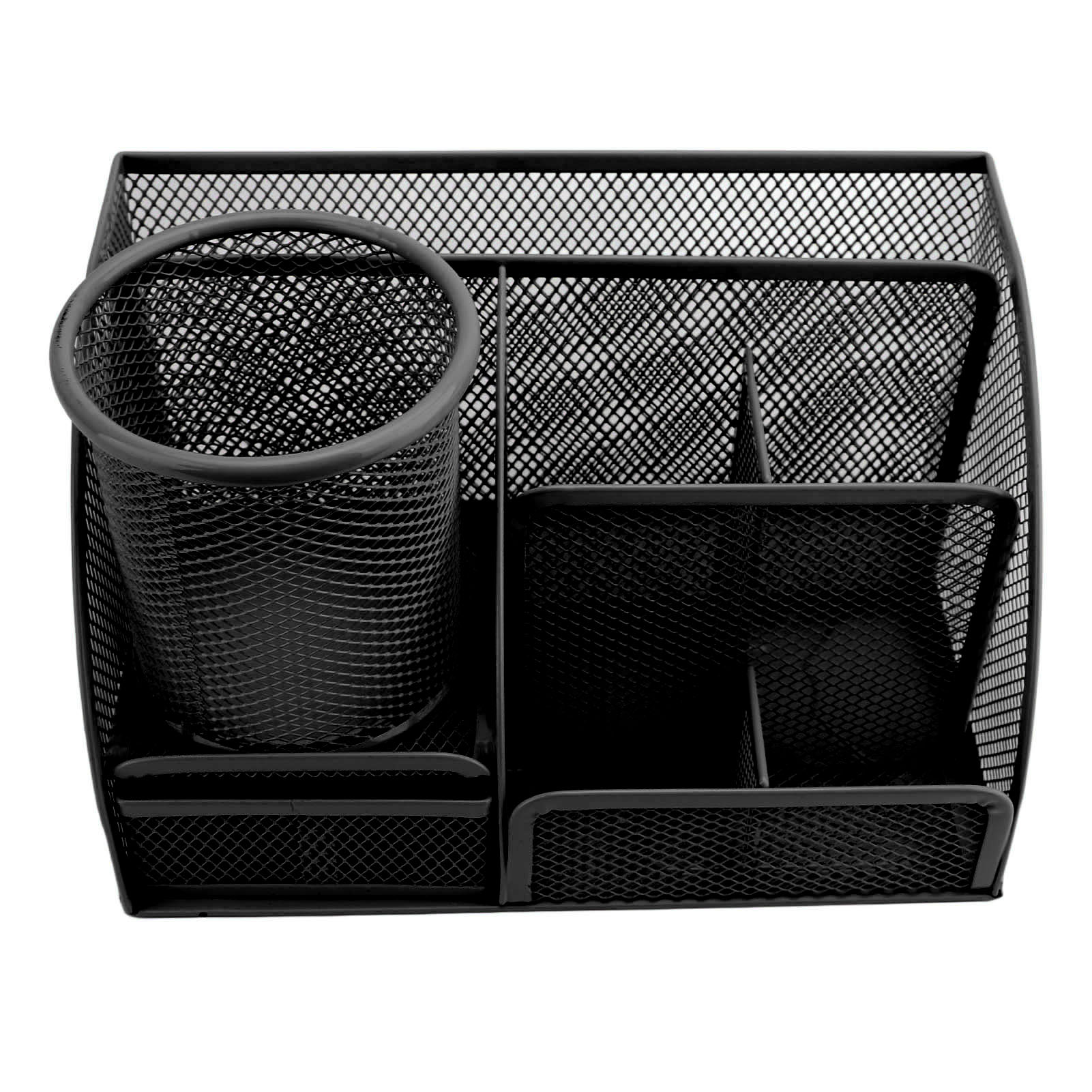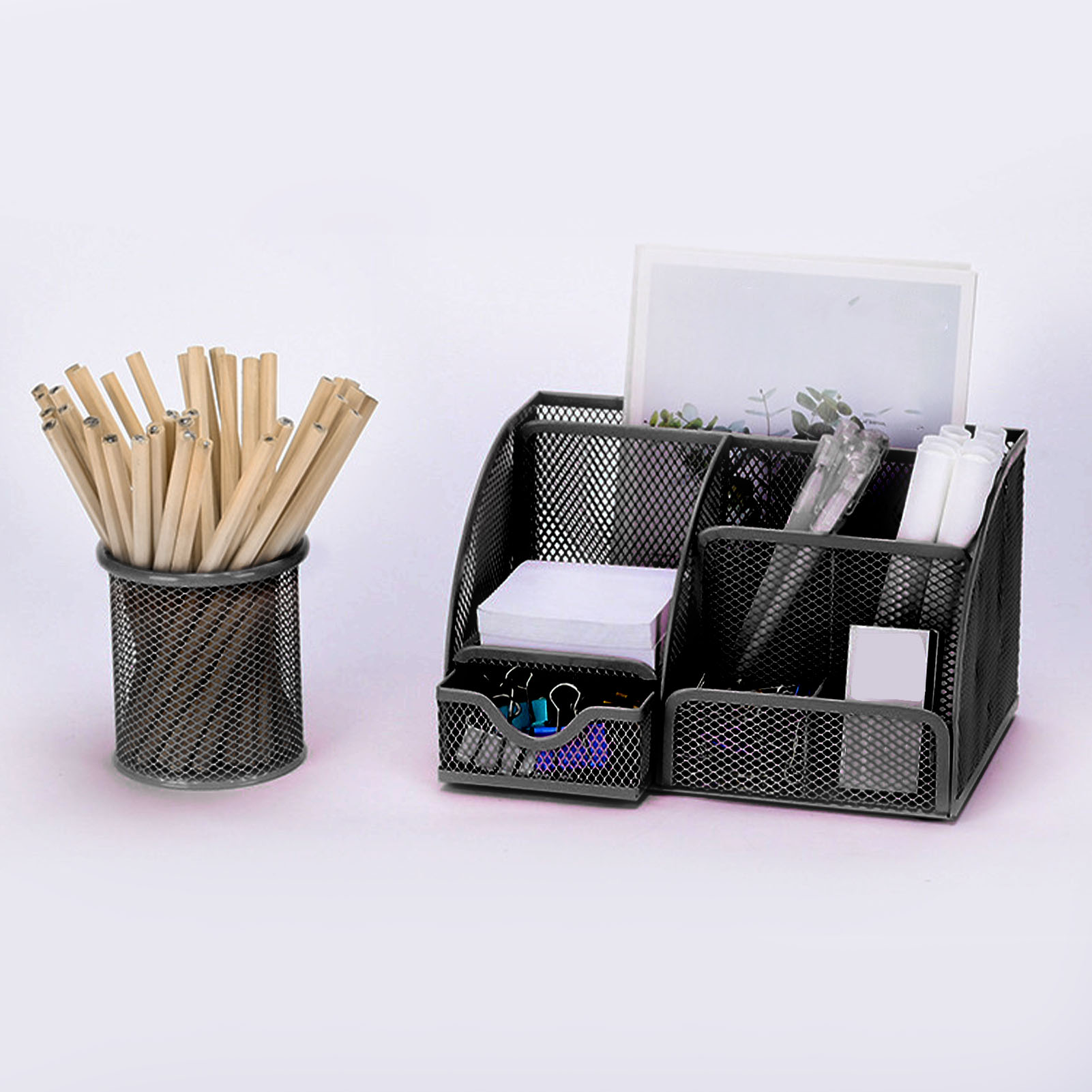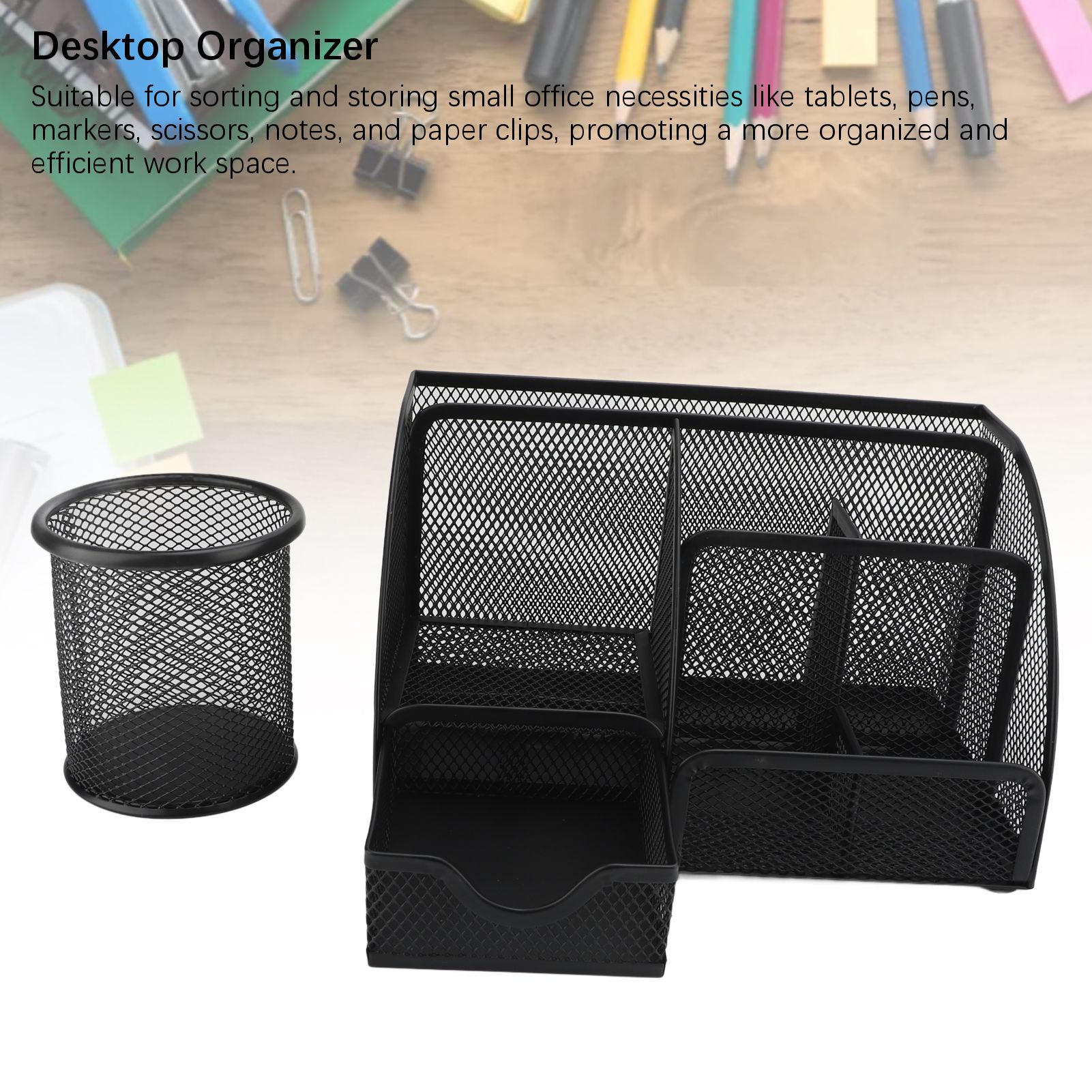 金属网状桌面收纳盒带抽屉 七格笔筒+圆形笔架 多功能文具办公用品收纳架 适用于办公室家庭学校 防刮底座 黑色