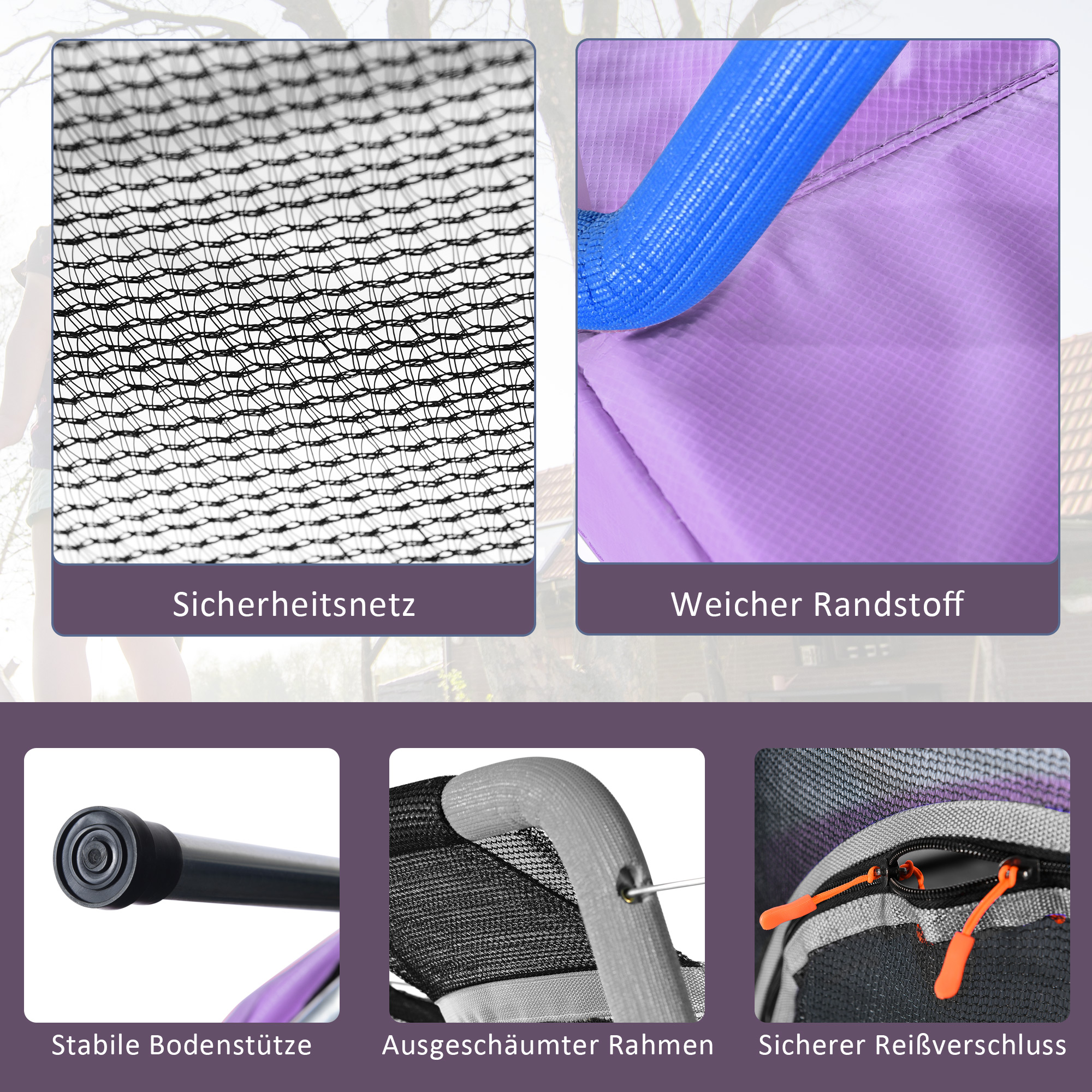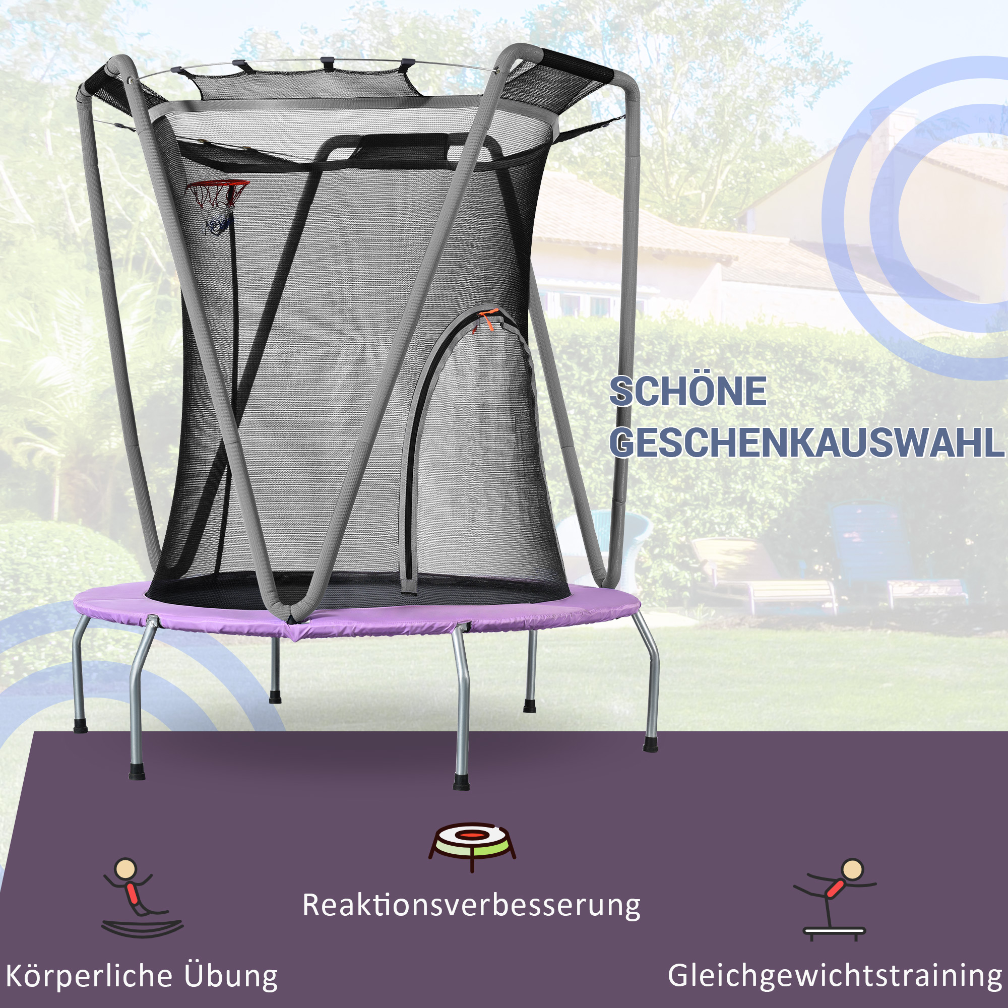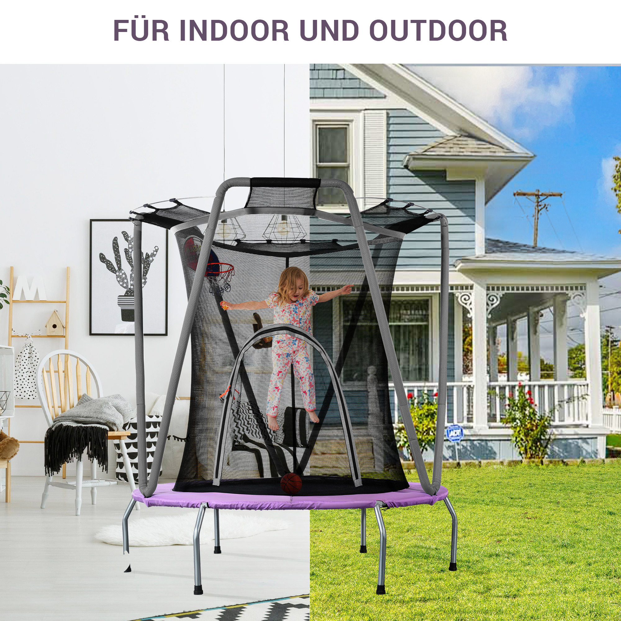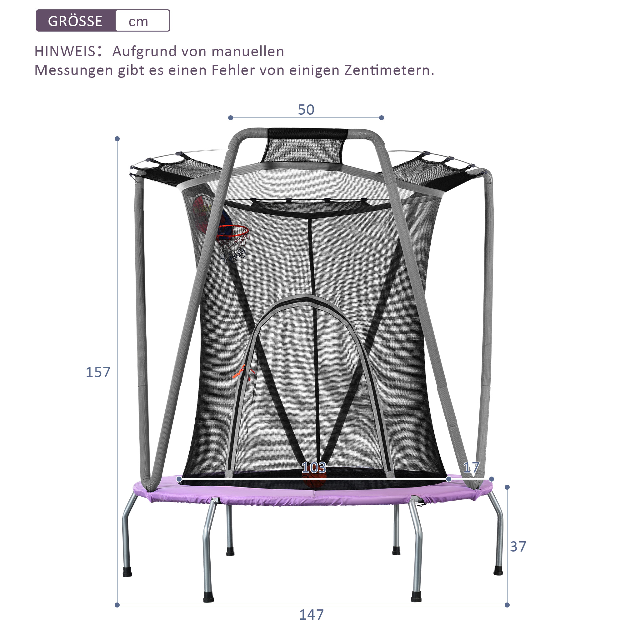 【带防护网】儿童蹦床 157cm家用室内外跳跳床 加厚钢管支架 附篮球框 U型双拉链门 承重50kg 适合3岁以上儿童 (灰色)